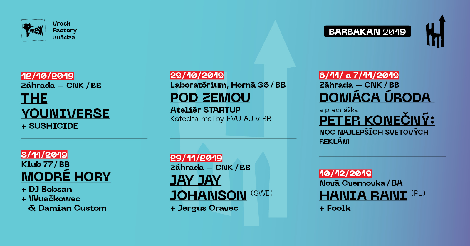 Už v sobotu 12. októbra odštartuje koncertná časť vystúpením domáceho objavu The Youniverse v Záhrade – Centre nezávislej kultúry (CNK). Kapela na čele so speváčkou Tammy a gitaristom Jergušom Oravcom vznikla už v roku 2015, no do povedomia sa začína dostávať najmä v posledných mesiacoch, kedy obchádza Slovensko s debutovým albumom CMYK so singlami Dark, Riverbanks a Silver. V Záhrade jej bude predskakovať ešte väčší nováčik na našej scéne – skupina Sushicide.