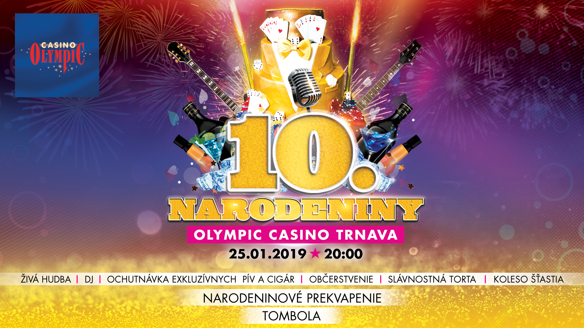 10.NARODENINY OLYMPIC CASINO TRNAVA s celovečerným zábavným programom, občerstvením, špeciálnymi ochutnávkami, kolesom šťastia, polnočnou SUPER TOMBOLOU a nebude chýbať ani bohaté narodeninové prekvapenie.