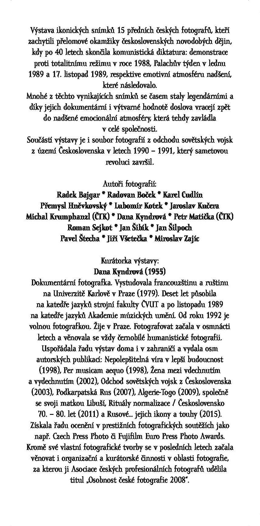 ,,Mnohé z týchto vynikajúcich fotografií sa časom stali legendárnymi a vďaka ich dokumentárnej i výtvarnej hodnote doslova vracajú naspäť do atmosféry, ktorá vtedy zavládla v celej spoločnosti. Súčasťou výstavy je súbor fotografií z odchodu sovietskych vojsk z územia Československa v rokoch 1990–1991, ktoré zamatovú revolúciu zavŕšil,“ dodáva kurátorka výstavy Dana Kyndrová.
