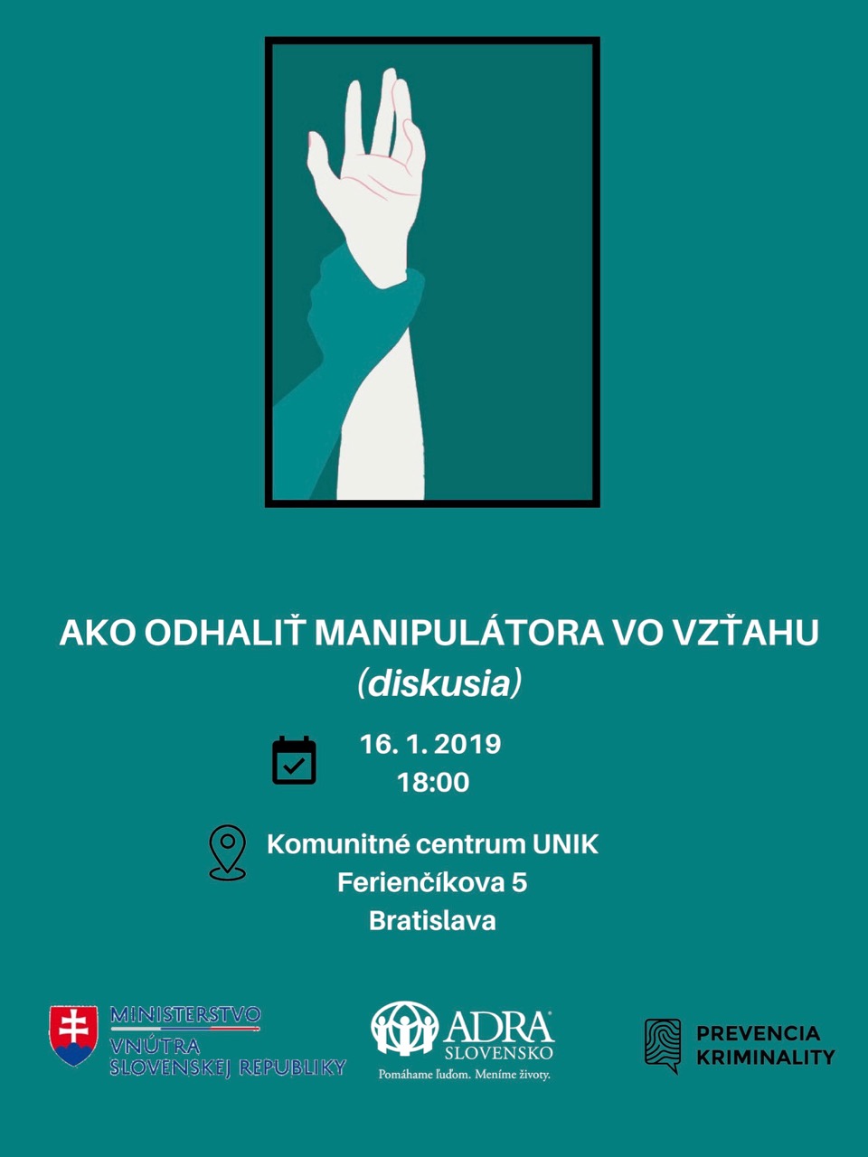 Členky Krízového intervenčného tímu (KIT) organizácie ADRA Slovensko vstúpili do roka 2019 s predsavzatím: naďalej hovoriť nahlas o násilí, organizovať viac osvetových aktivít a vzdelávacích podujatí pre rôzne cieľové skupiny v SR. Hneď prvá takáto diskusia sa uskutoční v stredu (16. januára) od 18ej v komunitnom centre UNIK na Ferienčíkovej ulici 5 v Bratislave pod názvom „Ako odhaliť manipulátora vo vzťahu“.