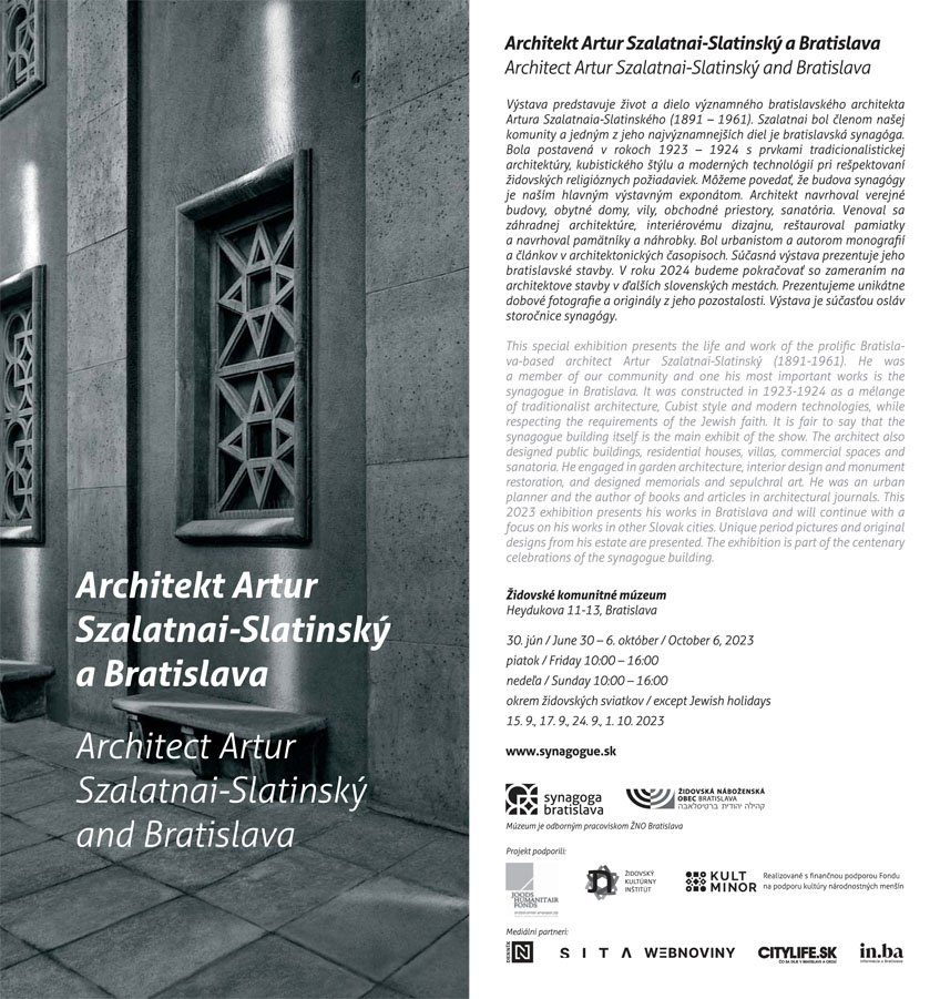 Architekt Szalatnai-Slatinský (1891–1961) navrhoval verejné budovy, obytné domy, vily, obchodné priestory, domy pre lekárov a sanatóriá. Zaoberal sa záhradnou architektúrou, interiérovým dizajnom a reštaurovaním pamiatok, navrhoval pamätníky a náhrobky. Bol urbanistom a autorom dvoch monografií a početných článkov v architektonických časopisoch na Slovensku aj v zahraničí. Jedným z jeho najvýznamnejších diel je synagóga na Heydukovej ulici. Bola postavená v rokoch 1923 – 1924 s prvkami tradicionalistickej architektúry, kubistického štýlu a moderných technológií, pri rešpektovaní židovských religióznych požiadaviek. Budova synagógy je tak hlavným exponátom výstavy Architekt Artur Szalatnai-Slatinský a Bratislava. Kurátormi výstavy sú riaditeľ Židovského komunitného múzea Maroš Borský a archeológ a múzejník Štefan Holčík.
