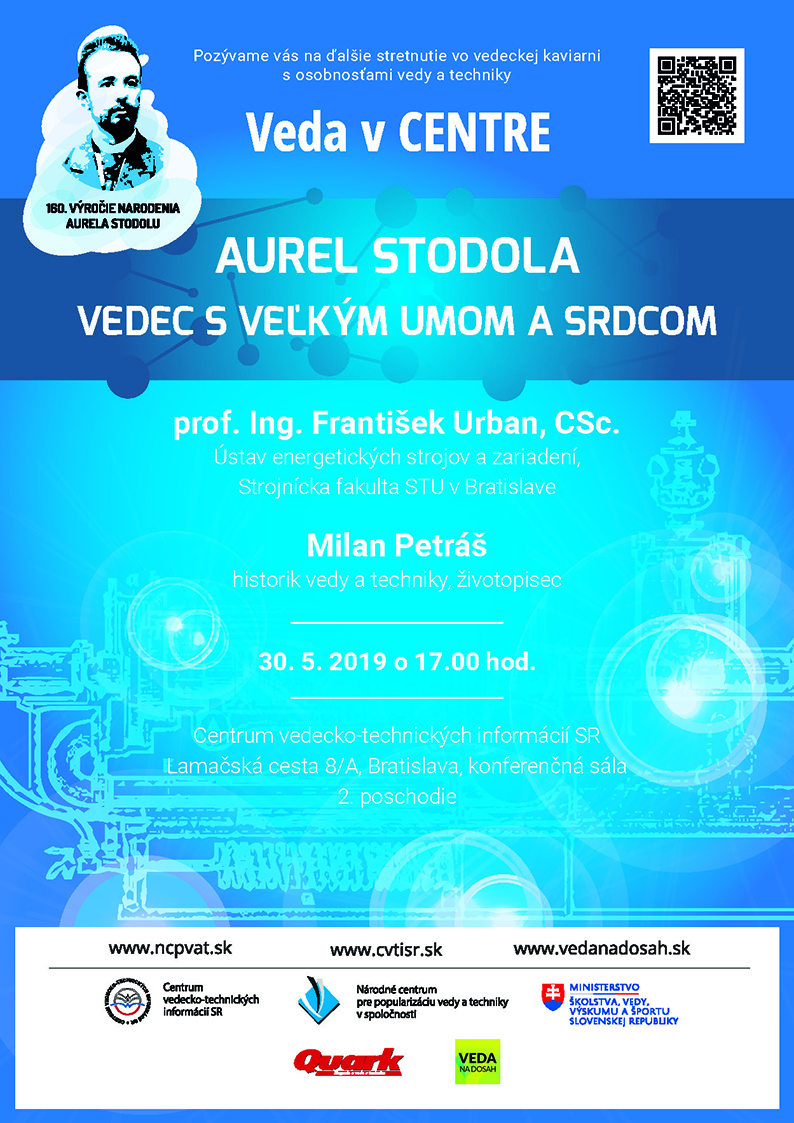 Vo štvrtok 30. 5. 2019 o 17.00 hod. privítame dvoch hostí, ktorí sú svojou celoživotnou vedecko-výskumnou prácou spojení s menom Aurela Stodolu. Prof. Ing. František Urban, CSc., z Ústavu energetických strojov a zariadení na Strojníckej fakulte STU a prodekan Strojníckej fakulty STU v Bratislave je jeho pokračovateľom, ktorý aj ako vysokoškolský pedagóg ďalej rozvíja a šíri Stodolov prínos v oblasti strojárstva. Druhým hosťom bude Milan Petráš, historik vedy a techniky, múzejník a životopisec, ktorý sa už 40 rokov zaoberá životom a dielom Aurela Stodolu. Je autorom publikácie Najväčší z veľkých – Aurel Bohuslav Stodola, ktorá je doposiaľ jedinou svojho druhu a najrozsiahlejšou monografiou, ktorá podáva komplexný obraz o slovenskom velikánovi vedy a techniky.