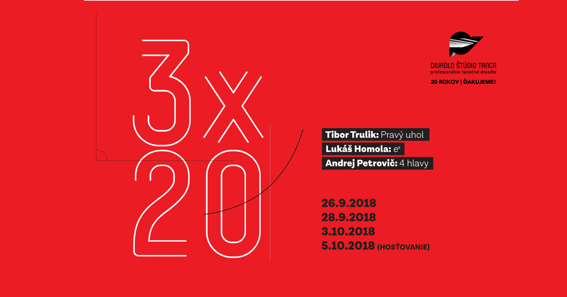 Projekt 3 x 20 je postavený na výpovedi troch zaujímavých umeleckých individualít v jednom večeri a zároveň je súčasťou osláv 20. výročia Divadla Štúdio tanca. Výsostne aktuálne témy a inšpirácie troch pozoruhodných choreografov – A. Petrovič, L. Homola, T. Trulik prinesú divákom novú skúsenosť v podobe troch kratších diel pod názvami: 4 Hlavy, ex a Pravý uhol.