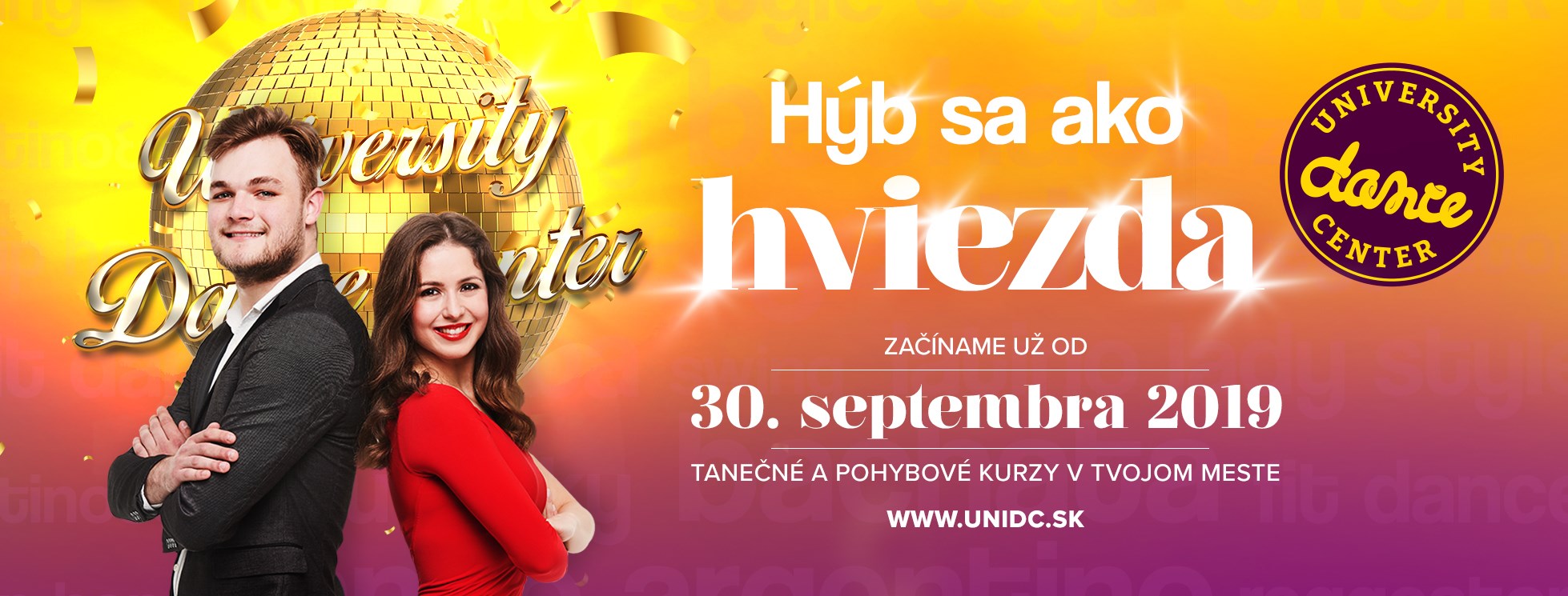 Zimný semester je už čoskoro za dverami a aj ty si môžeš spestriť svoj študentský život s University Dance Center priamo na svojej škole. Príď sa zabaviť a odreagovať spolu s kamarátmi na tanečné a pohybové kurzy, ktoré začínajú už od 30. septembra 2019.