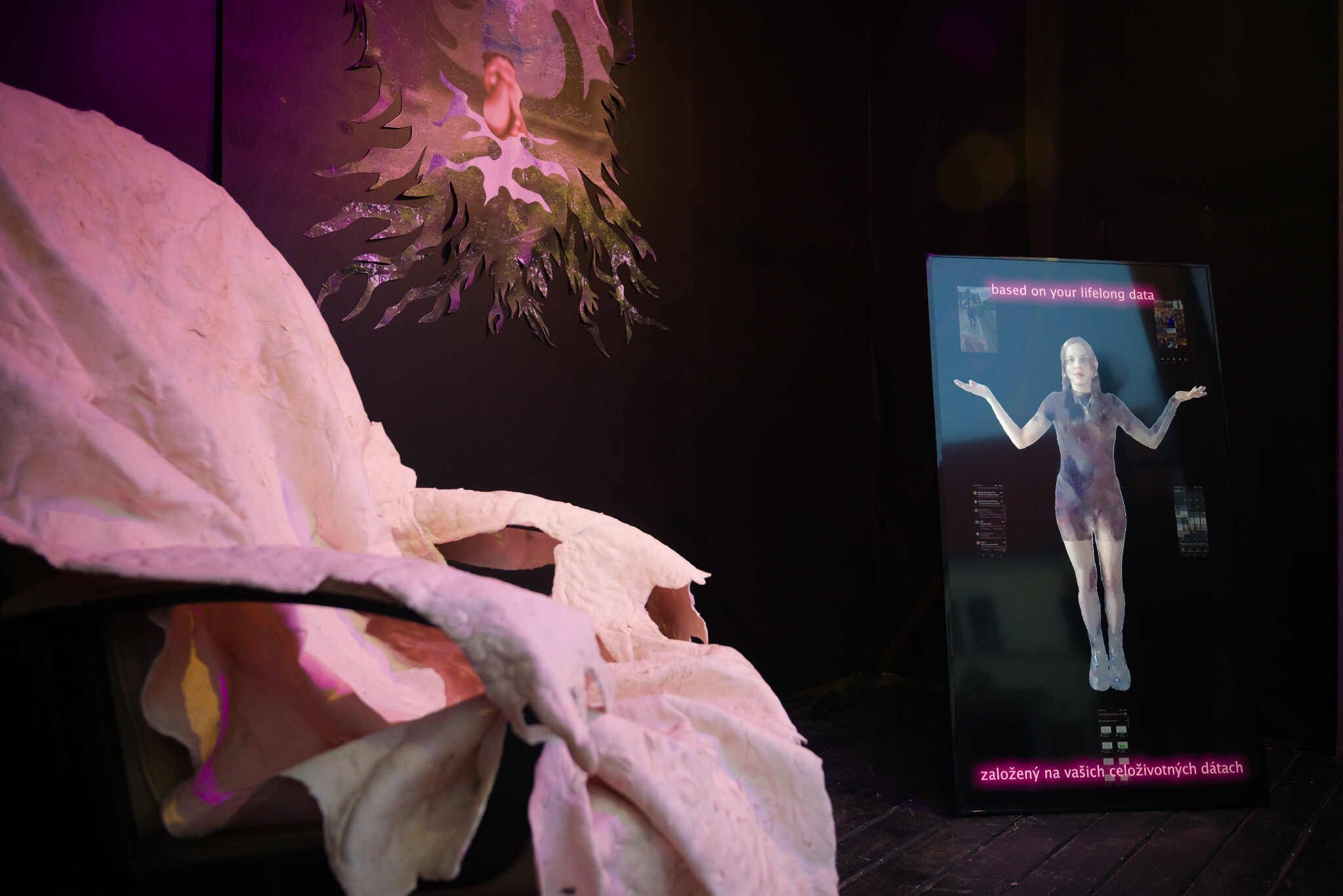 Výstava SOFT SYNC autorky Barbory Jurčovej (1999) prezentuje jej rozsiahlejší magisterský výskum, ktorý nedávno obhájila na VŠVU v Bratislave, čím sa stala čerstvou absolventkou Ateliéru APK+ pod vedením Antona Čierneho a Jaroslava Kyšu. Barbora Jurčová sa venuje intermediálnym projektom, v ktorých skúma témy tela a identity na rozhraní online a offline priestoru. Prostredníctvom rôznych médií – od analógových cez digitálne až po ich vzájomné kombinácie a presahy – narúša zaužívané hierarchie vnímania ľudskej podoby a vytvára environment, kde sa prelína biologické s digitálnym, fyzické s virtuálnym. Vo svojej umeleckej praxi kriticky nazerá na ego a nadradenosť človeka. Ten sa často javí ako krehký a hľadajúci si svoje miesto v rámci verejného priestoru a života. Jurčová skúma situácie a prostredia, ktoré ho obklopujú a formujú, ale ktoré i on spätne ovplyvňuje a snaží sa zanechať svoju stopu, vpísať sa do pamäte. Diela Barbory Jurčovej majú naratívny charakter s prvkami dystópie alebo utópie a rozohrávajú hru akejsi medzidruhovej komunikácie a spolunažívania, ktorá ústi do výzvy k rozmanitosti a prijatiu inakosti. Diverzitu autorka vníma ako prijateľný model fungovania budúcnosti, ale i dneška.