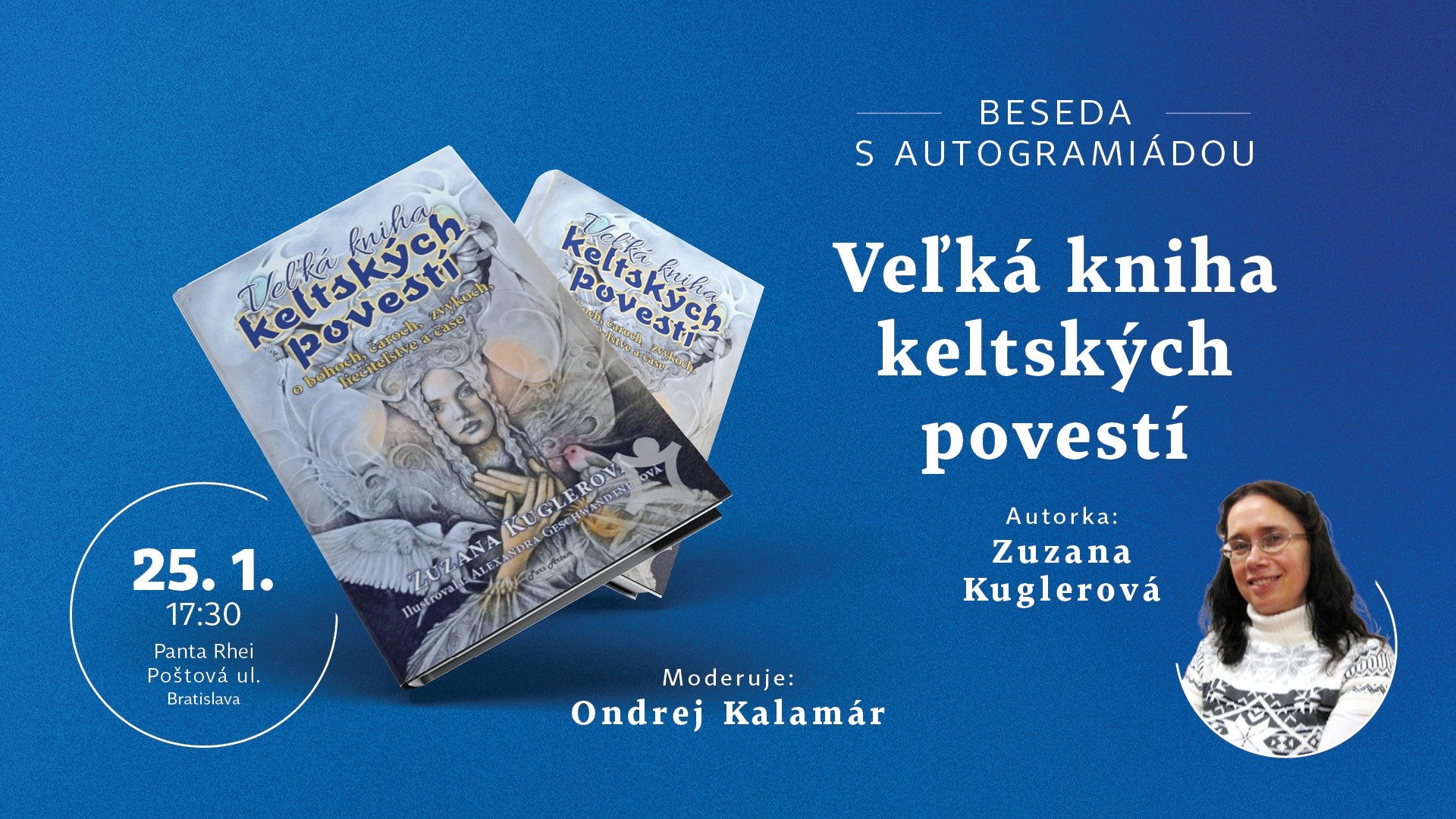 Srdečne vás pozývame na besedu a autogramiádu autorky Zuzany Kuglerovej k titulu Veľká kniha keltských povestí, ktorá sa uskutoční 25.1. o 17:30 v kníhkupectve Panta Rhei - Poštová Bratislava.
