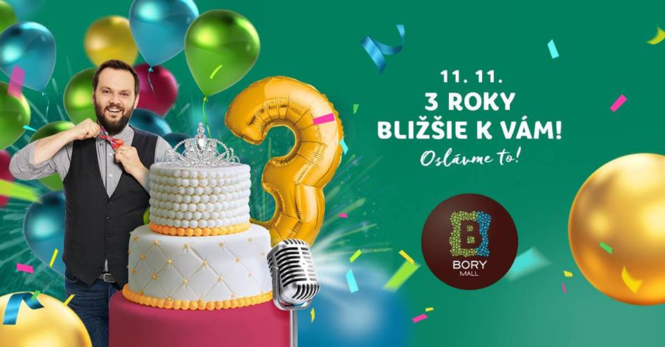 Ohňostroj, súťaž o Najkrajšiu tortu s magazínom Praktická Slovenka, moderátor Junior, známe tváre zo seriálov TV JOJ, karaoke, muzikál MAMMA MIA! a nesmrteľné hity skupiny ABBA sa postarajú v sobotu 11.11. o obrovskú porciu narodeninovej zábavy! Odkrojíme si z okúzľujúcej torty k rozprávkovým tretím narodeninám najmladšieho nákupno-zábavného centra Bory Mall v Bratislave.