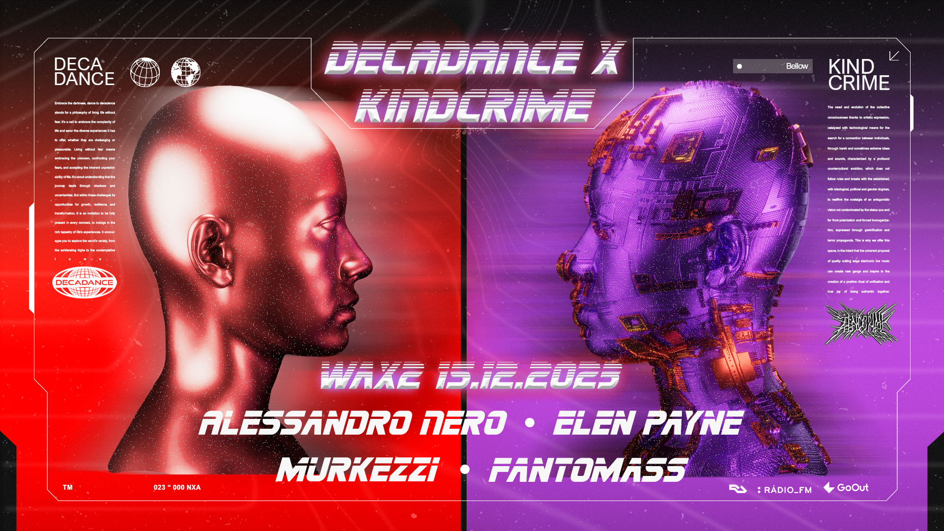 Futuristický štýl KINDCRIME kolektívu bude v kontraste s nadčasovým zvukom oldschoolovej selekcie DECADANCE predstaviteľov MURKEZZI a FANTOMASSA vytvárať špecifickú atmosféru témy eventu s názvom FUTURO RETRO.