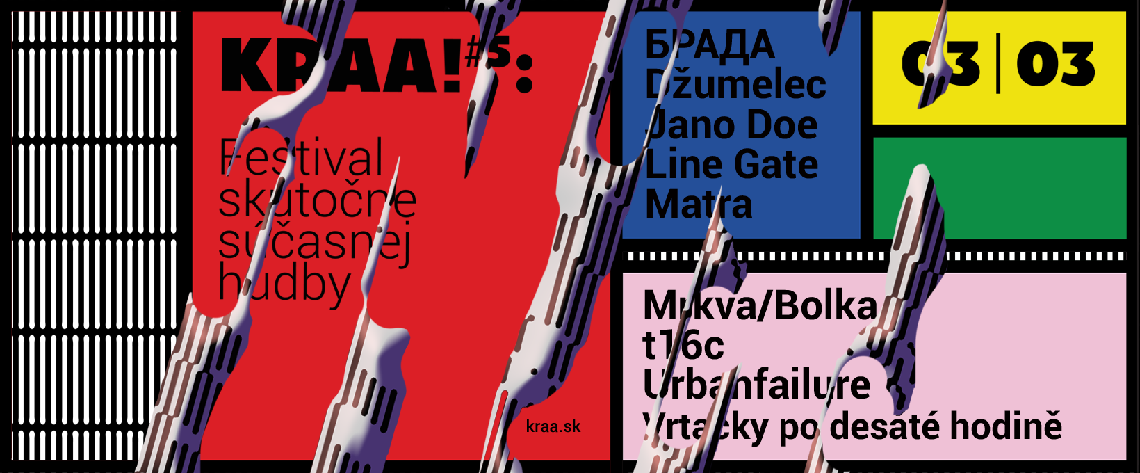 Na piatom ročníku festivalu Kraa čakajte hudobný maratón. V jeden večer sa predstaví 9 slovenských projektov, ktoré sú životaschopné, originálne, menej známe, a stoja za pozornosť. Na každom ročníku festivalu zatiaľ hrali iné kapely a projekty. Niekedy sa hudobníci prelínajú, ale podmienkou festivalu je, aby tam vždy hralo niečo nové. Za 5 rokov sa tak podarilo predstaviť vyše 50 rôznych projektov, čo je úctyhodné na tak malú krajinu.