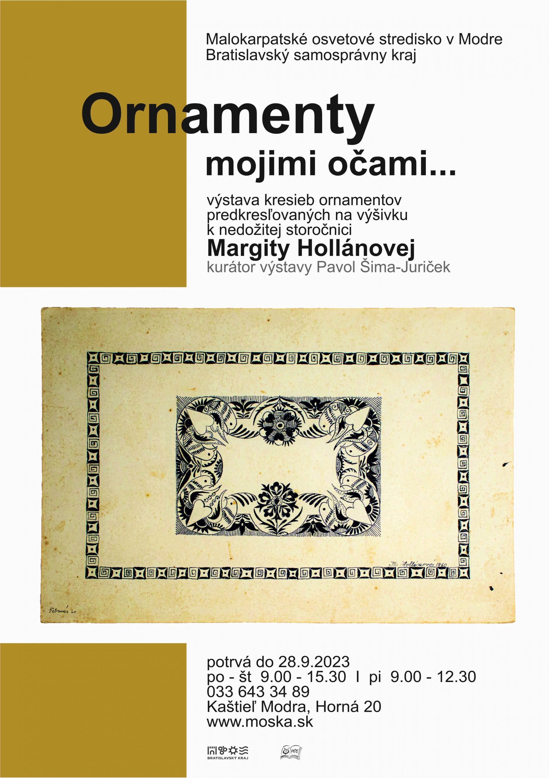 Výstava ornamentov k nedožitej storočnici Margity Hollánovej “Ornamenty mojimi očami” v Kaštieli v Modre je pre verejnosť prístupná od 8. do 28. septembra 2023, počas návštevných hodín – od pondelka do štvrtka v čase od 9:00 do 15:30 a v piatok od 9:00 do 12:30. Viac informácií o možnosti jej návštevy nájdete na stránke www.moska.sk