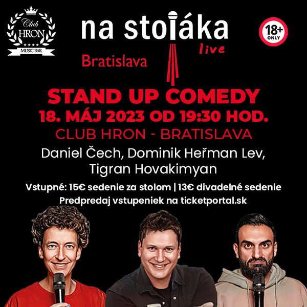 Táto česká STAND UP komedy, po druhý krát u nás v klube HRON. Skvelí český komici k nám zavítajú, už 18.5.2023. Zárukou zábavného večera bude česká trojica komikov: Daniel Čech, Dominik Heřman Lev, Tigran Hovakimyan