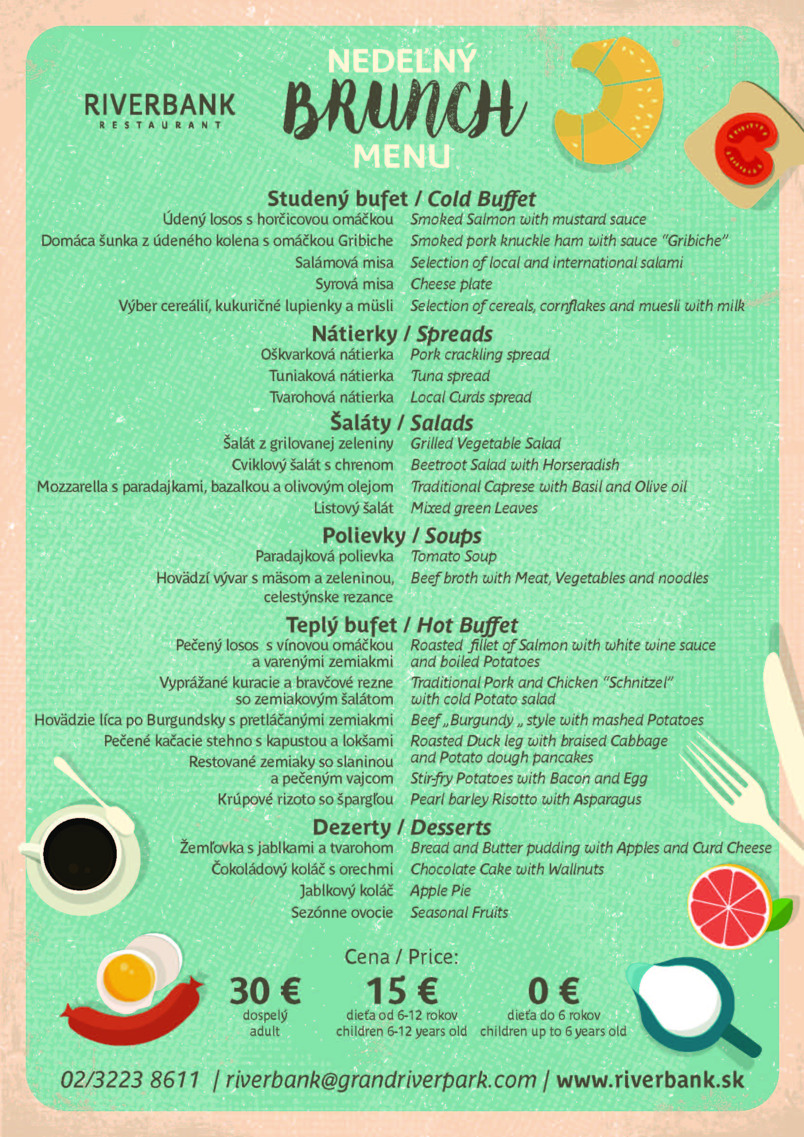 Obľúbený nedeľný brunch je späť! Zažite ho s celou svojou rodinou v Riverbank Restaurant a vychutnajte si bohatý výber teplých i studených delikates od šéfkuchára Jaroslava Žídeka. O príjemnú atmosféru sa počas nedeľňajšieho poobedia postará klavirista a deti sa môžu tešiť na Červenú čiapočku, ktorá ich zavedie do ríše rozprávok.