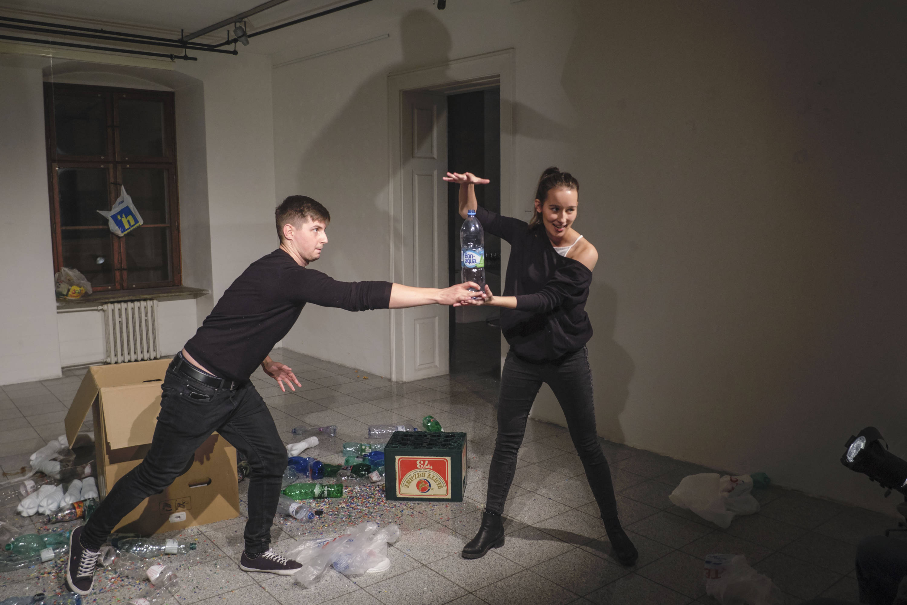 Kolektív Divadla Non.Garde v inscenácii Plastové nebo hľadá odpovede na otázky ako “prečo sa plast začal vyrábať, prečo sa stal neodmysliteľnou súčasťou našich životov a prečo je také ťažké žiť bez neho?”