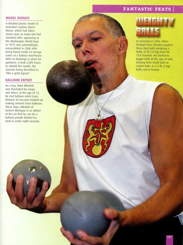 o ustanovenie nového svetového rekordu v behu na 100m za súčasného žonglovania tromi bowlingovými guľami. Milan Roskopf, majiteľ niekoľkých zápisov v Guinessovej knihe rekordov si trúfa zvládnuť túto disciplínu v čase 38 minút!!! Zároveň som bol informovaný, že súčasťou podujatia bude aj prekonanie súčasného svetového rekordu v behu na 100m za súčasného žonglovania tromi 5kg guľami úradujúcim majstrom sveta v tejto disciplíne, Radekom Šatkom.