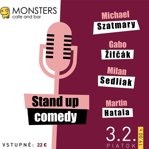 STAND UP COMEDY sa uskutoční v piatok 3. februára 2023 o 19.00 h vo vnútorných priestoroch Monsters cafe and bar!