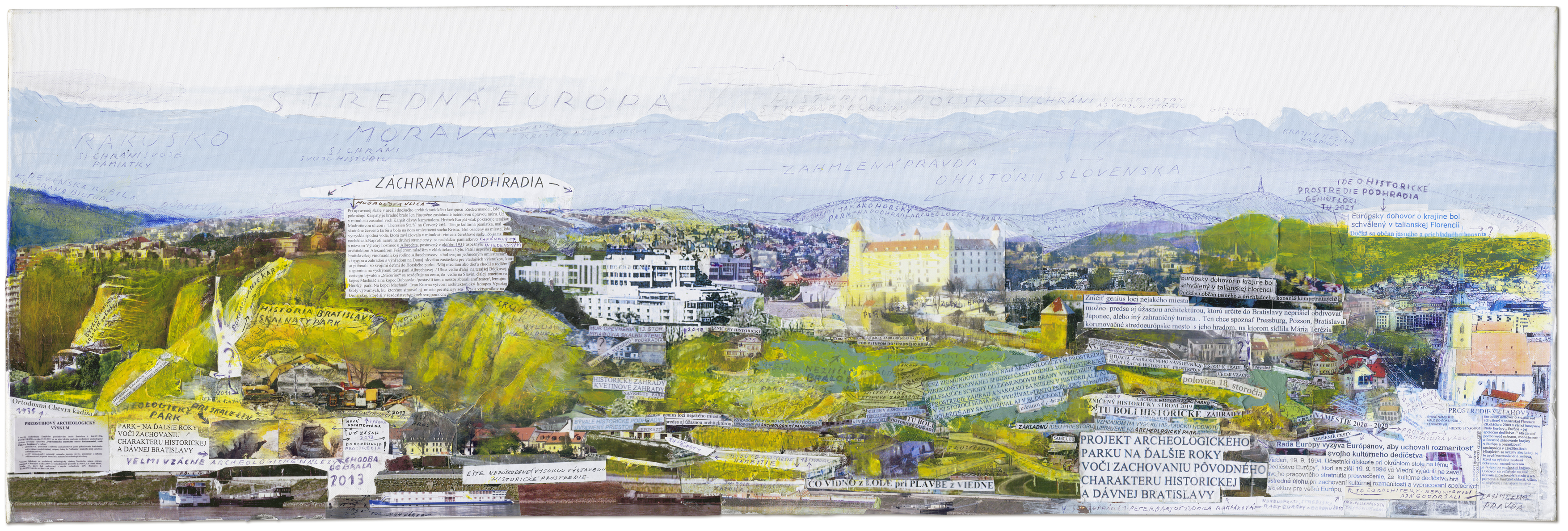Foto: To, čo mohlo byť, keby to nezničili. Z cyklu Dráma bratislavského podhradia. 2010 – 2021. Spolupráca: Ľudmila Rampáková. Olej, ceruza, pero, koláž, papier, plátno. SNG