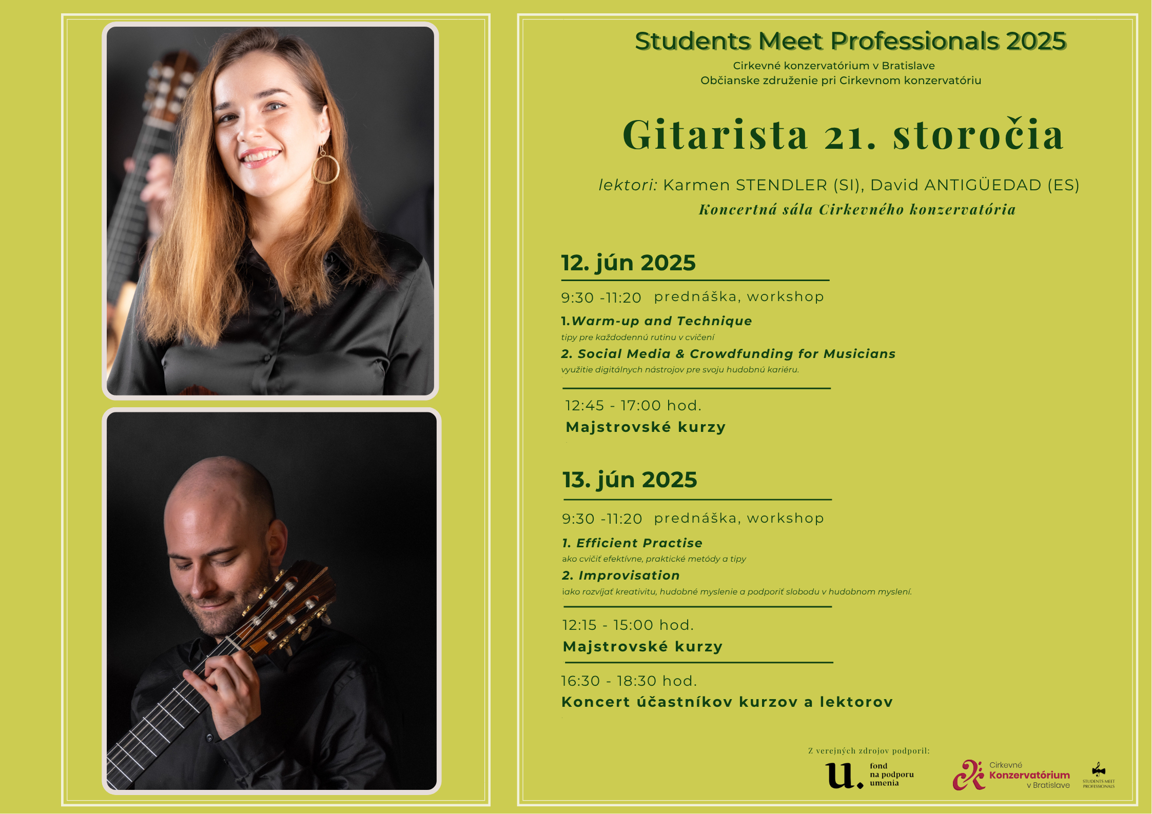 Najbližšie podujatie jarnej časti projektu Students Meet Profesionals privíta - KARMEN STENDLER - mladú slovinskú gitaristku, ktorá pravidelne ako sólistka účinkuje aj komorná hráčka na medzinárodných stupňoch a je nositeľkou cien z viacerých prestížnych medzinárodných gitarových súťaží a - DAVIDA ANTIGŰEDADA - španielskeho gitaristu pôsobiaceho v Nemecku, ktorý vyštudoval huslistu pod vedením Španielska, Holandsko a Nemecko Nemecko Mateo González, Àlex Garrobé a Ricardo Gallén a aj u flautistov Anna Garzuly-Wahlgren. Práve s poslednými dvoma pedagógmi zavŕšil v roku 2024 svoje štúdium prestížnym diplomom Konzertexamen.