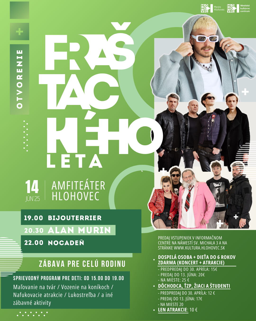 Zaži nezabudnuteľný štart leta v Hlohovci! Mesto Hlohovec a Mestské kultúrne centrum ťa pozývajú na otvorenie Fraštackého leta 2025, ktoré sa uskutoční v sobotu 14. júna 2025 v nádhernom prostredí Amfiteátra Hlohovec. Čaká ťa večer plný hudby, energie a zábavy pre celú rodinu! Tešiť sa môžeš na silnú dávku rocku, popu aj modernej slovenskej hudby od obľúbených interpretov!