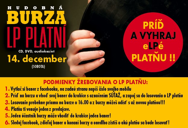 Novinkou! decembrovej, dá sa povedať vianočnej burzy bude možnosť vyhrať LP platnu v losovaní. Viac info na FB stránke: Burza platní Košice