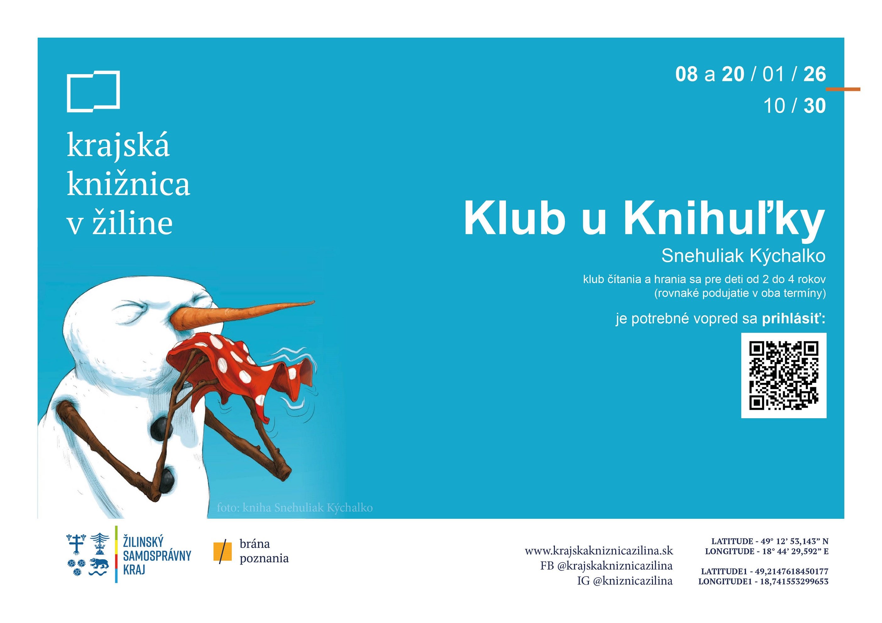 Stavali ste už túto zimu snehuliaka? Určite áno, veď je to také jednoduché. Stačia nám tri snehové gule, mrkva a gombíky na oči. Čo ale so snehuliakom, ktorý sa stále roztápa, kýcha, alebo mu je zima? Spoločne zistíme, či mu vieme pomôcť, skúsime ho znovu postaviť a pritom sa riadne zabavíme. Príďte na zážitkové čítanie v utorok 20. januára 2026 o 10:30 v Krajskej knižnici v Žiline.