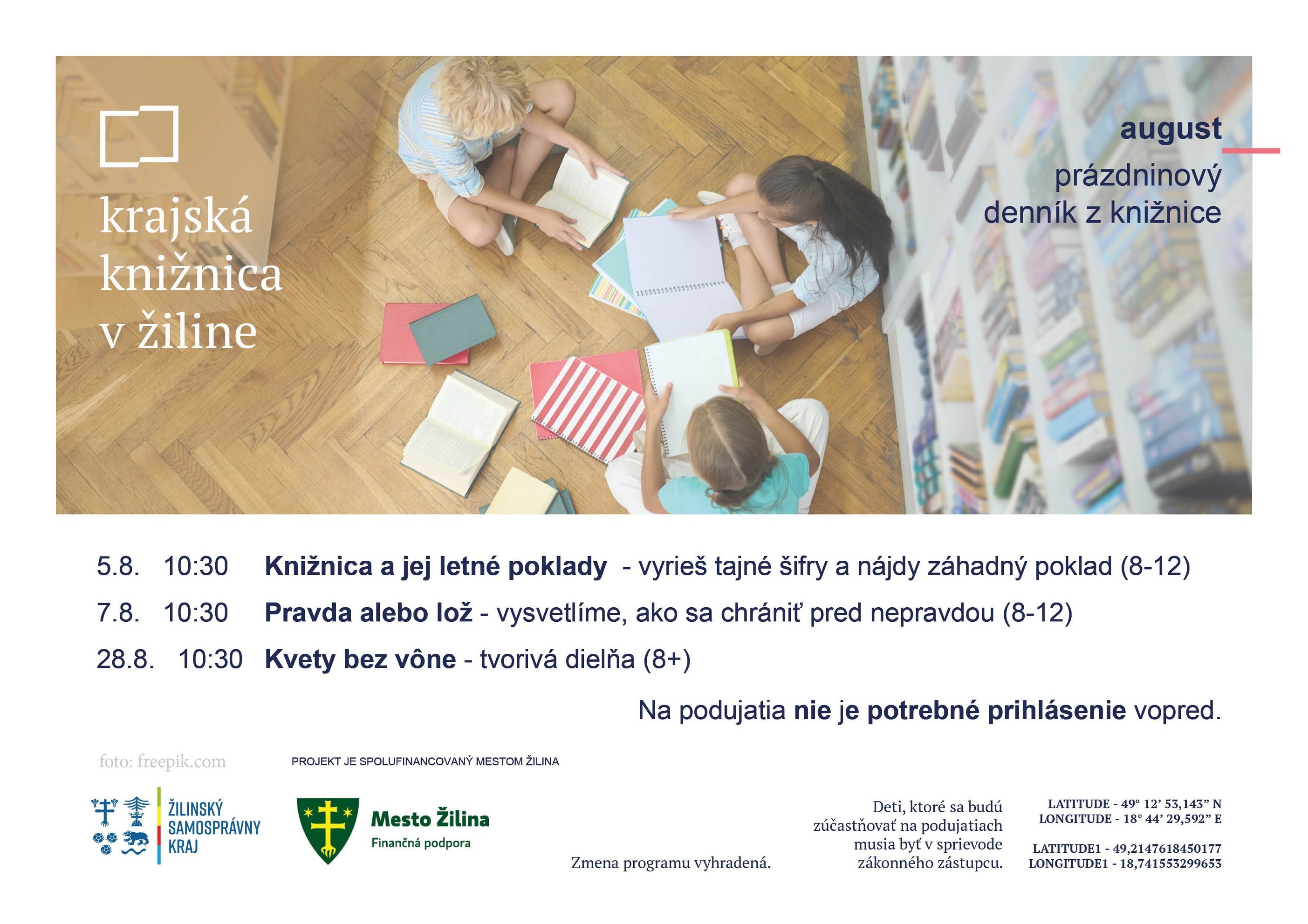Deti budú hľadať tajné šifry ukryté v knižnici a v okolí knižnice, ktoré ich dovedú k záhadnému pokladu. Aby sa k nemu dostali, budú musieť vyriešiť viacero úloh, hádaniek a držať sa rôznych indícií, ktoré budú skrývať obľúbené rozprávkové bytosti, hrdinovia a známe literárne postavy. Poďte s nami hľadať poklady v utorok 5. augusta o 10:30 v Krajskej knižnici v Žiline. Podujatie je vhodné pre deti od 8 do 12 rokov v sprievode rodičov alebo starých rodičov. Na podujatie nie je potrebné sa vopred prihlásiť.