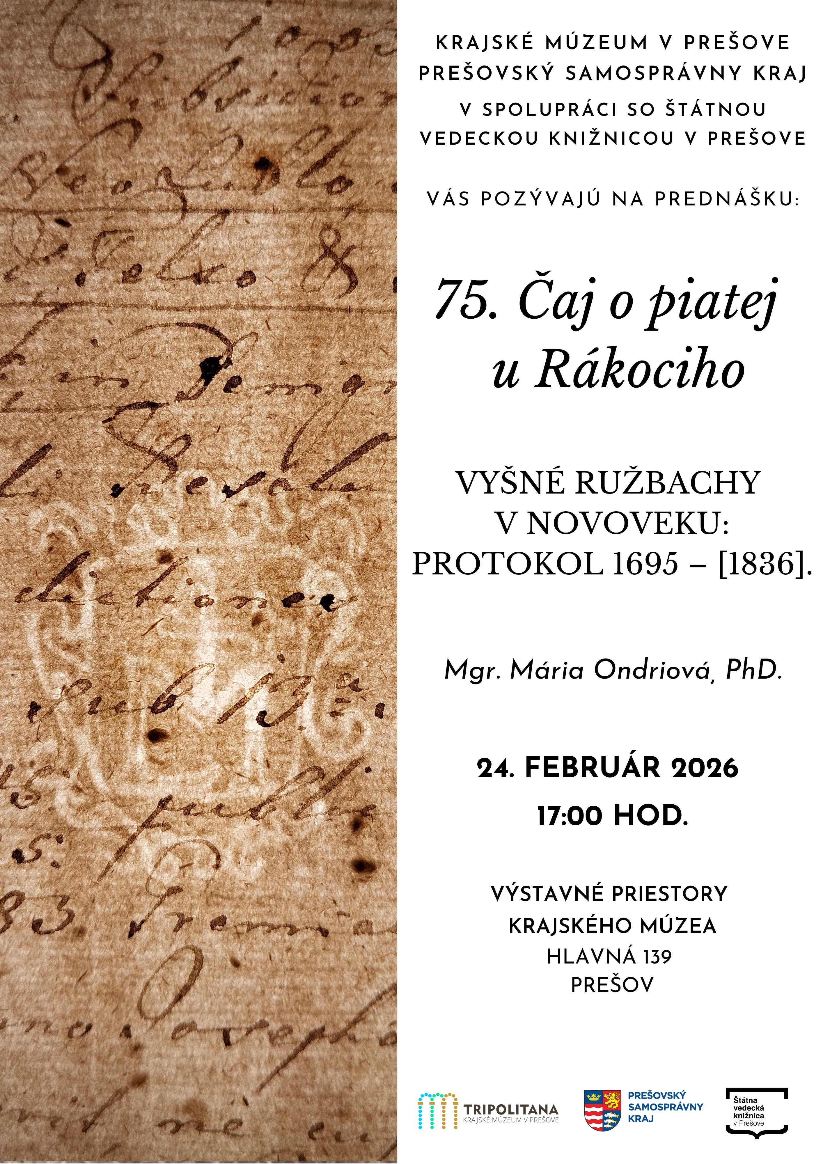 Pozývame vás na ďalšie popoludnie pri čaji a histórii. Našou hosťkou bude historička Mária Ondriová, ktorá predstaví svoju knihu Vyšné Ružbachy v novoveku: Protokol 1695 – [1836].