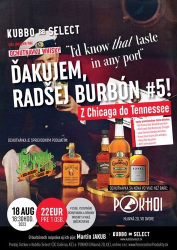 Pozývame Vás na ochutnávku prémiových amerických whiskey, taktiež známych pod menom "burbóny". Spoločne cestu začneme v Chicagu v destilérke Koval, ktorá produkuje výhradne organické whiskey, pokračovať budeme v Kentucky, kde sa zastavíme prechutnať burbóny Old Grand-Dad s históriou od roku 1882!, cestovanie zakončíme v Tennessee v ikonickej destilérke Jack Daniels.