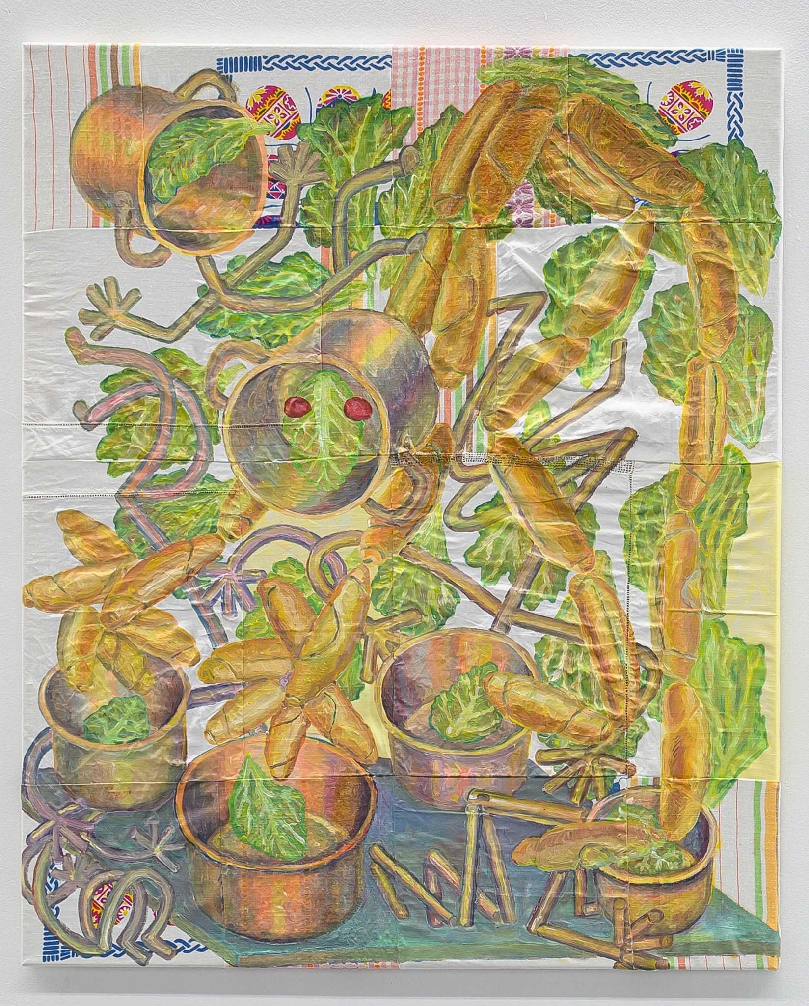 Domáce náčinie a jedlo, ktoré žena každodenne pripravuje, ju však už neobklopujú, ale samé ožívajú v antropomorfných postavách, pripomínajúcich portréty manieristického umelca Arcimbolda z ovocia či zeleniny. Starostlivosť o deti a domácnosti je nekonečnou prácou, ktorá môže mať za následok tiché, postupné rozplývanie identity. Preto je možné postavy čítať aj opačne, nie ako oživené kulisy domácnosti, ale ako bytosť stratenú v opakujúcich sa činnostiach.
