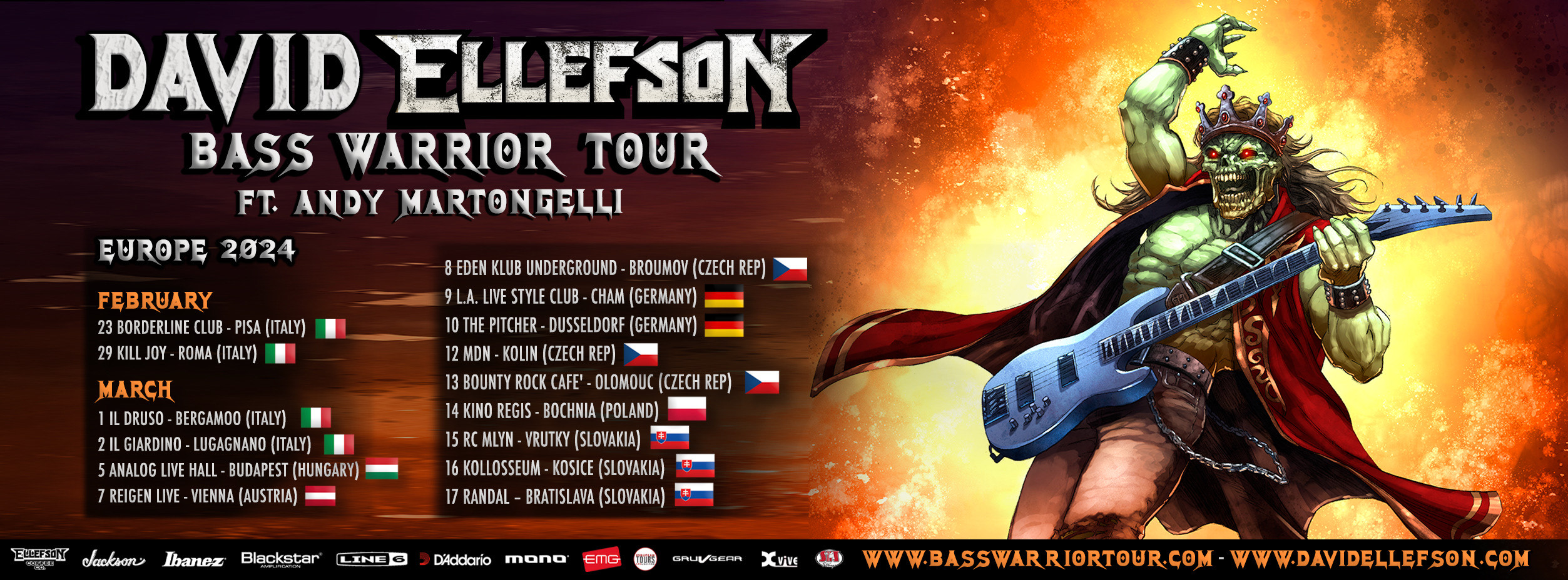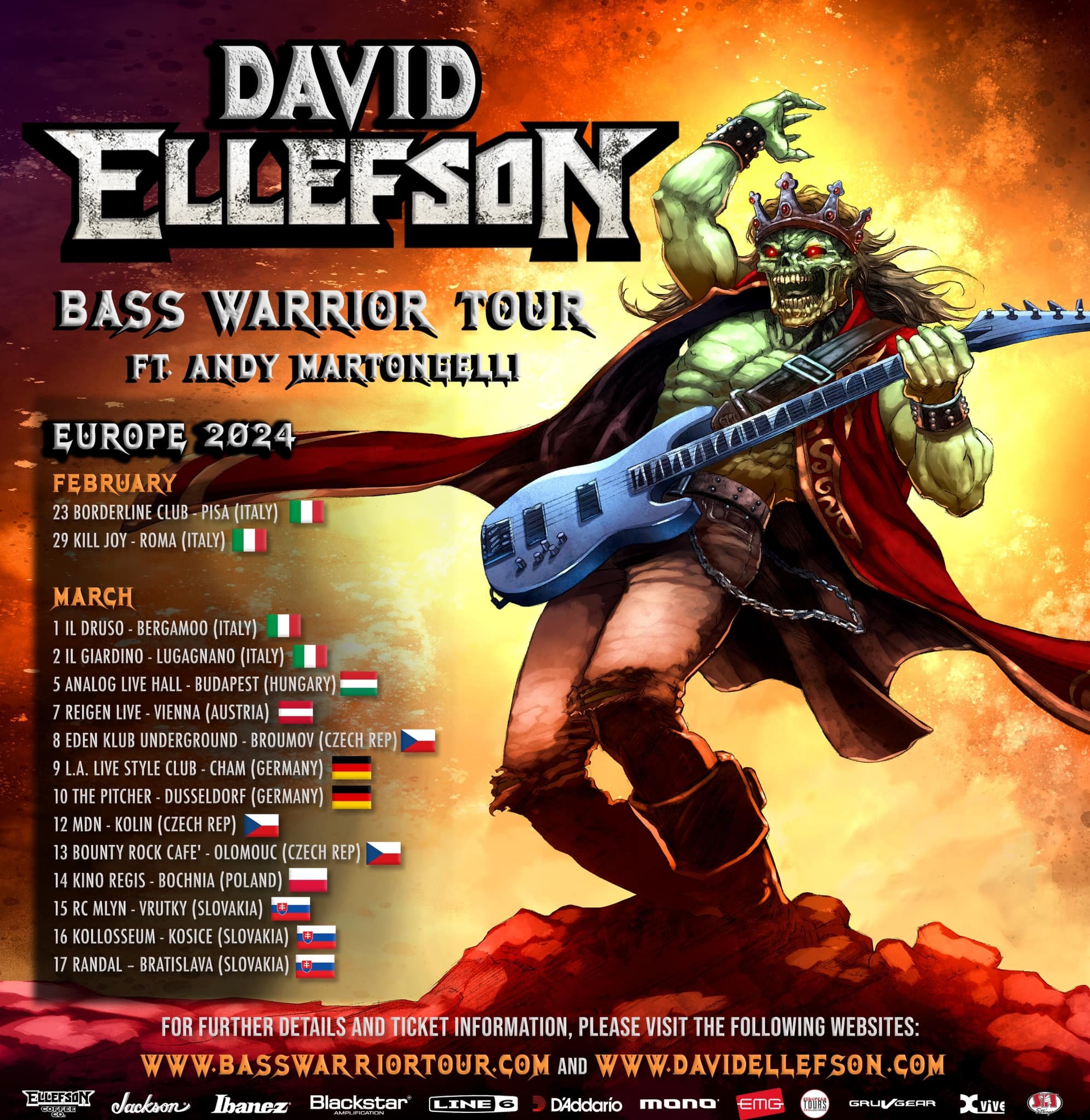 David Ellefson predstavuje svoje BASS WARRIOR TOUR, v ktorom poteší vybrané európske mestá podmanivým večerom s milovanými klasikami, hlbokými strihmi a bystrym rozprávaním príbehov. Táto cesta bude zahŕňať jeho úlohu spoluzakladateľa MEGADETH, jeho sólový materiál ELLEFSON a ďalšie.