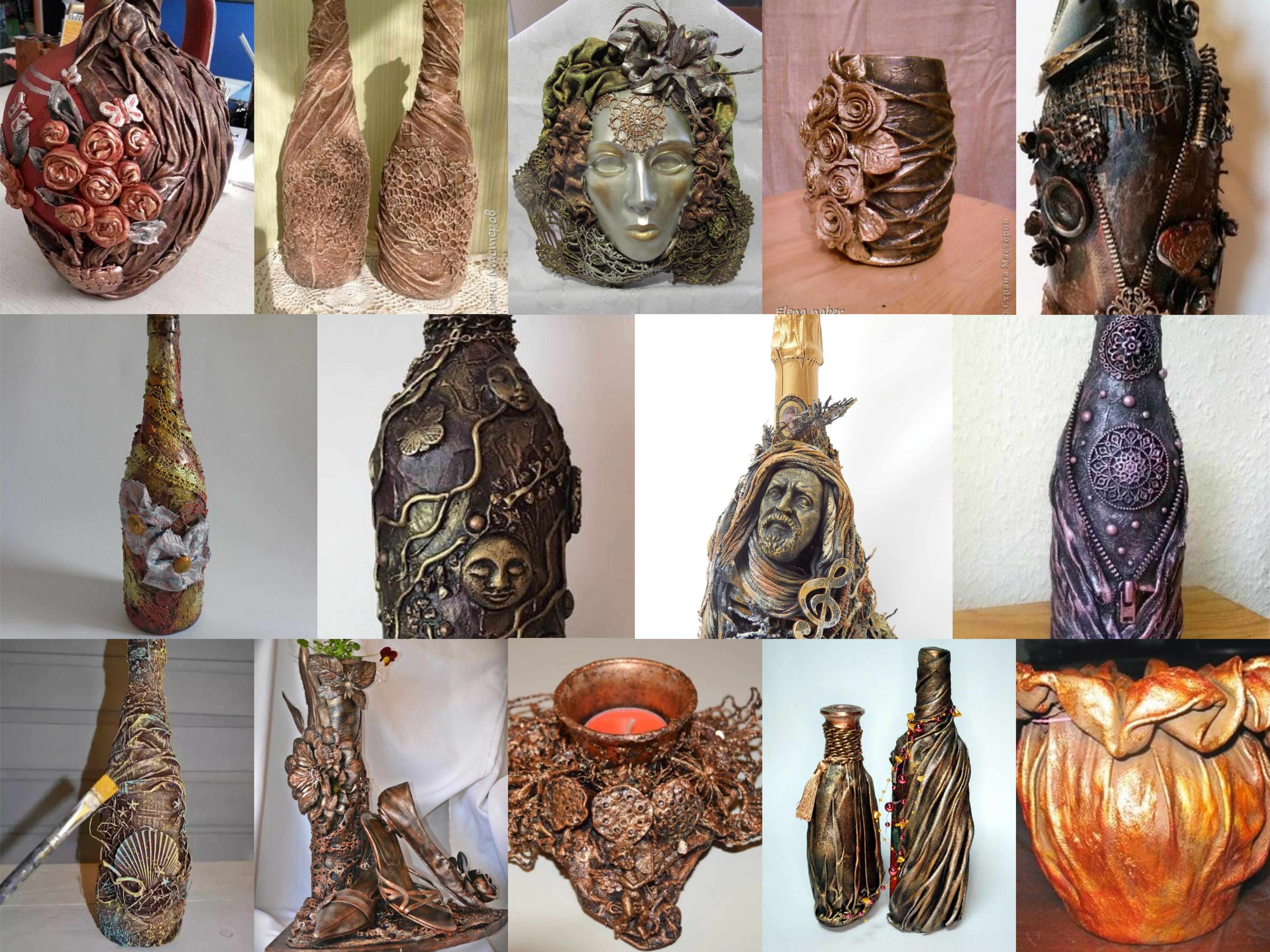 Táto technika je veľmi vhodná na recykláciu, napr. sklenených fliaš. Paverpol doplníme farbami, textíliami, patinami a drobnými dekoračnými predmetmi.