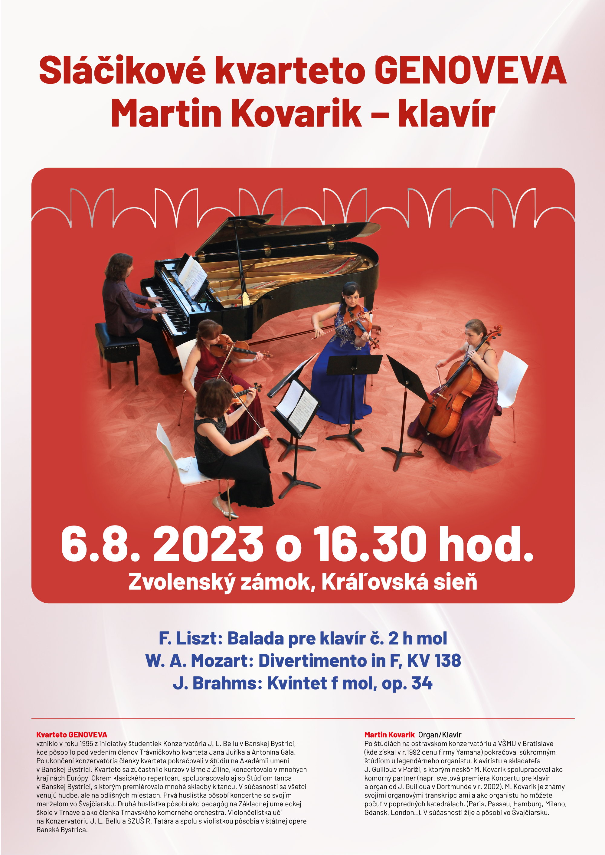 Koncert „Sláčikové kvarteto GENOVEVA a Martin Kovarik – klavír“ Zvolenský zámok Nedeľa 6. august 2023│16.30 Vstupné dobrovoľné