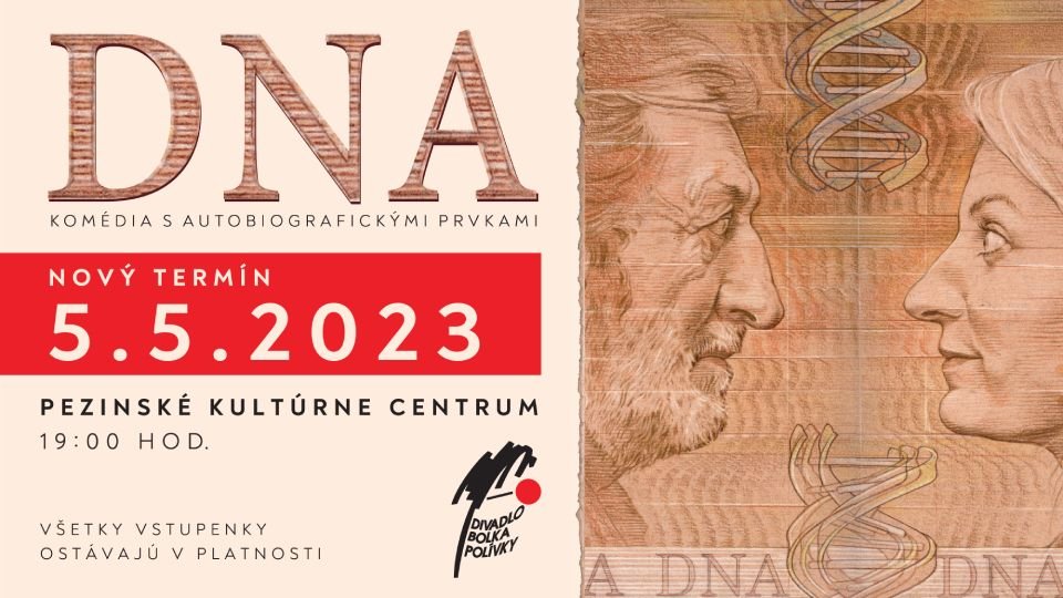 POZOR ZMENA! Vážení návštevníci, dovoľujeme si Vás informovať, že divadelné predstavenie DNA sa uskutoční v náhradnom termíne 5.5.2023 o 19.00 hod. Zakúpené vstupenky zostávajú v platnosti.