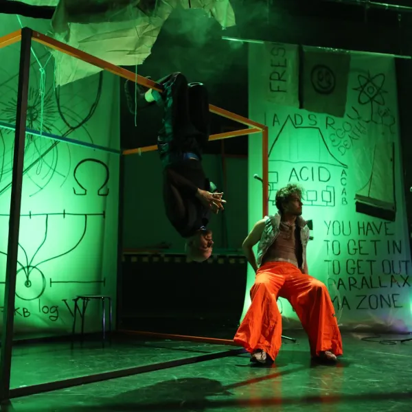 Tí dvaja v noci tancujú v rytme techna, ich telá sa prepletajú s inými telami, akoby pretvárali človeka, priestor, čas. Cez deň sa budia v kocke panelákového bytu a zakrývajú si uši pred všetkými, ktorí im chcú vnútiť predstavy o správnom živote a kopu iných sračiek. Trochu deväťdesiate roky, ale aj nie, veď pandémia sa skončila, jeden z nich utiekol pred vojnou a drogy sú už tiež komodita na neoliberálnom trhu. Odmietajú vedieť, čo chcú, hlasno obhajujú svoje právo stratiť sa v hľadaní. Ako môžu títo dvaja prežiť v tejto kríze žitia?