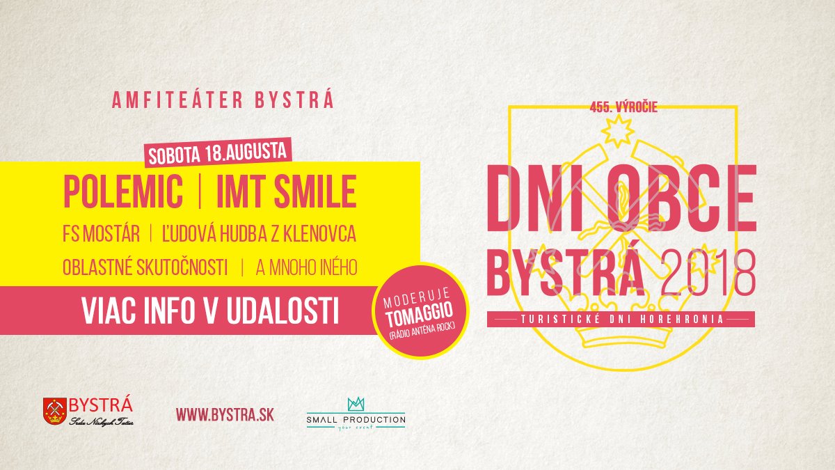 OBEC BYSTRÁ & SMALL PRODUCTION Vás pozývajú na: DNI OBCE BYSTRÁ 2018 & Turistické dni Horehronia, ktoré sa uskutočnia v dňoch 17.08.2018 - 19.08.2018