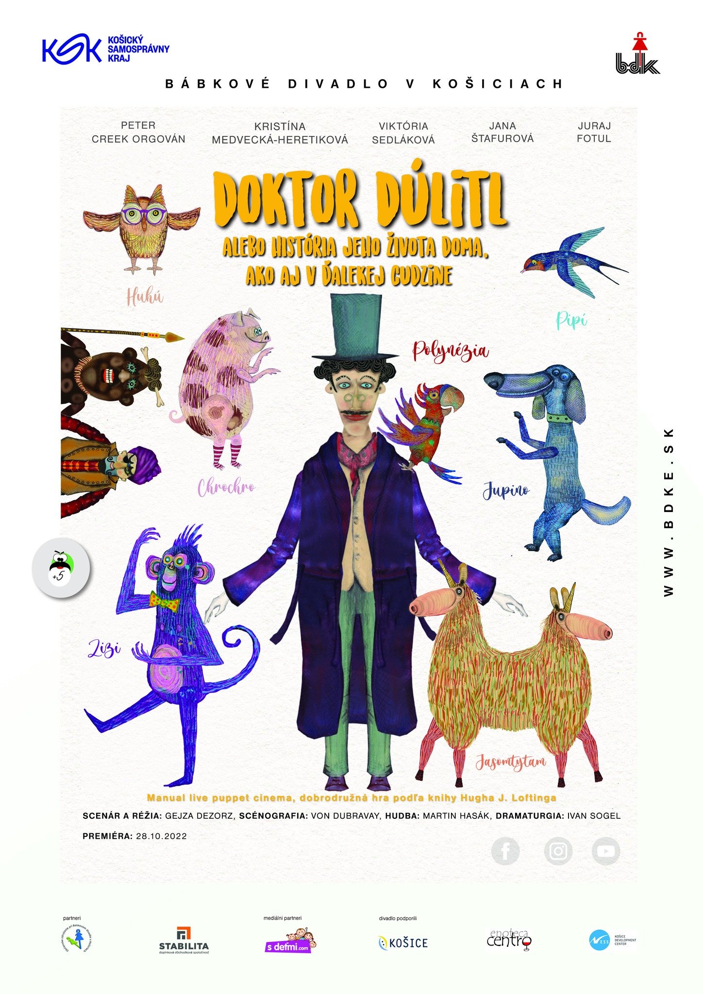 Britský spisovateľ Hugh J. Lofting vytvoril legendárnu postavu dr. Dolittla pre svoje deti. Dolittle – bláznivý dobrodruh, psychológ, vegetarián a milovník zvierat sa prvýkrát objavil v autorových ilustrovaných listoch, ktoré písal svojim deťom počas prvej svetovej vojny. Loftingovi tieto listy neskôr poslúžili ako zdroj pre tvorbu mnohých kníh o pojašenom, ale nesmierne ľudskom doktorovi, ktorý neliečil ľudí, ale zvieratká. Text našej “exotickej” inscenácie vychádza z mnohých motívov prvej knihy o bláznivom a milom psychológovi, ktorý sa naučí rozumieť reči zvierat a začne ich liečiť. Takto stratí ľudských pacientov a dostane sa do existenčných problémov. Neskôr sa preplaví do Afriky, kde prežije veľké dobrodružstvo, vylieči tam národ opíc, zasiahnutých smrteľnou epidémiou a vyviazne zo zajatia zloducha, ktorý túži ovládnuť svet. Na čiernom kontinente získa darom exotickú dvojhlavú gazelu, ktorá mu po návrate domov pomôže vymaniť sa z finančných problémov a on tak môže ďalej pomáhať milovaným zvieratám. Prerozprávame univerzálnu tému o večnom priateľstve medzi človekom a zvieratami. Hravou a humornou formou chceme inscenovať príbeh tohto krásneho priateľstva, bez ktorého by ľudskému druhu chýbalo poznanie komplexnosti jeho existencie.