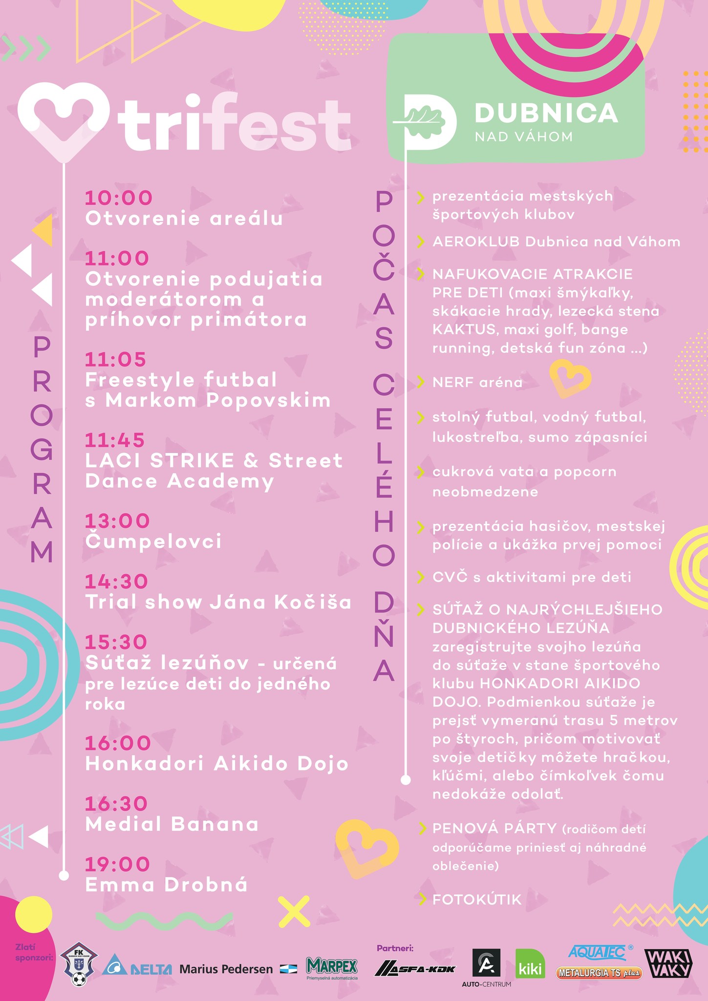 Tešiť sa môžete na množstvo celodenných nafukovacích a zábavných atrakcii pre deti i dospelých. Vystúpi kapela Medial Banana, Emma Drobná, Laci Strike a Street Dance Academy, Čumpelovci a so zatajených dychom sa spoločne pozrieme na Trial šou v podaní Jána Kočiša a nielen to. Čaká na vás viac ako 20 zábavných atrakcií - skákacie hrady, maxišmýkalky, lezecká stena, Nerf aréna, maxi golf, lukostreľba, vodný futbal, či detská fun zóna.