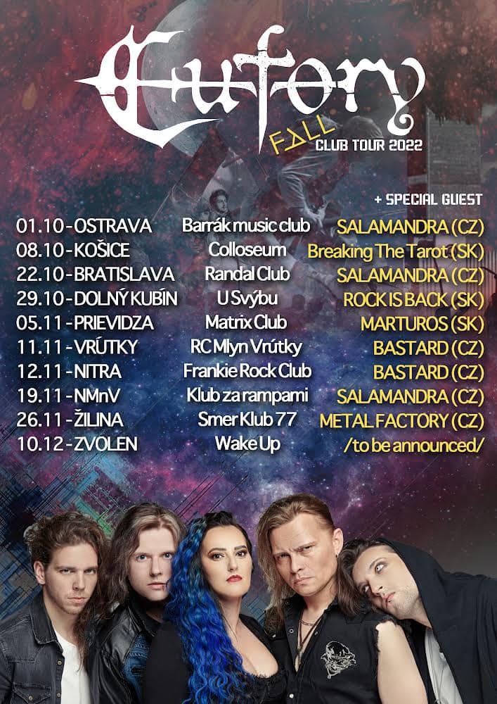Po vydarených letných festivaloch sa kapela Eufory vracia do klubov! V rámci Fall Club Tour 2022 sa predstavia v mestách naprieč celým Slovenskom, spolu so zaujímavými hosťami! Nenechaj si ujsť rock/metalovú nálož skvelej muziky.