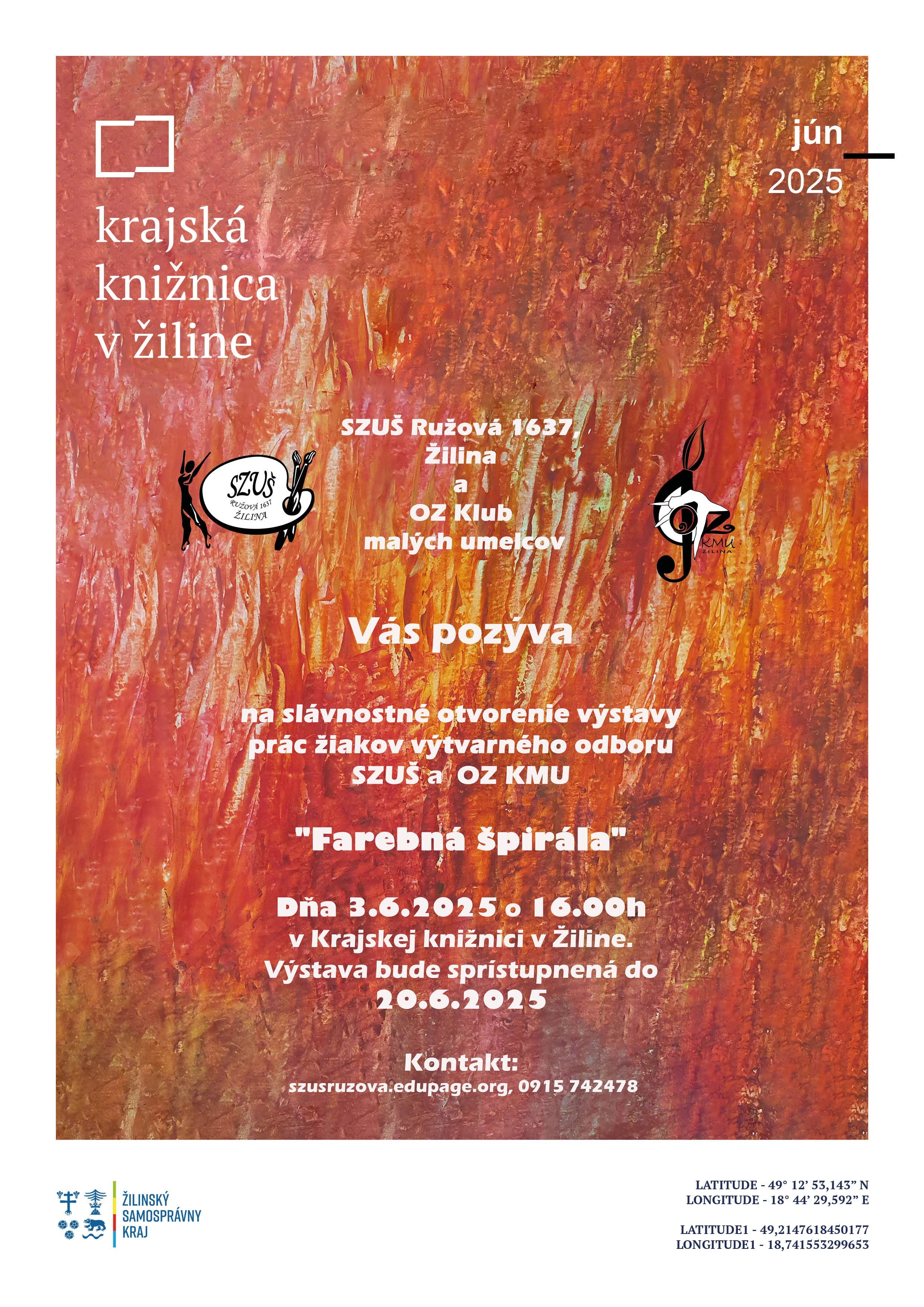 Pozývame vás na vernisáž výstavy detských prác žiakov výtvarného odboru Súkromnej ZUŠ, Ružová 1637, Žilina, ako aj členov výtvarného klubu OZ Klub malých umelcov, ktorá sa uskutoční v utorok 3. júna o 16:00 v Krajskej knižnici v Žiline. Výstavu si v knižnici môžete pozrieť do 20. júna.