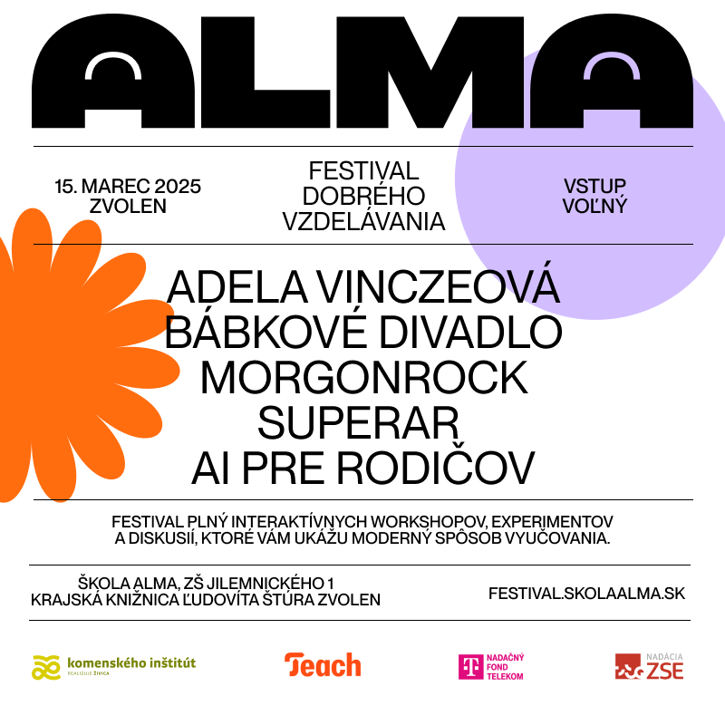 Všetkých vás srdečne pozývame na Festival dobrého vzdelávania ALMA, ktorý je oslavou učiacej sa školy a kvalitného vzdelávania.