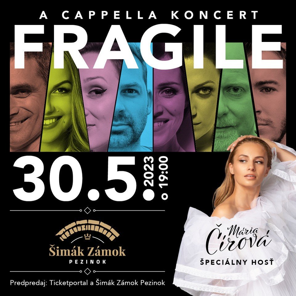 Každý koncert skupiny FRAGILE je oslavou ľudského hlasu, ale aj ukážkou toho, čo všetko je ním možné dokázať. Ich špeciálny koncert v prekrásnom prostredí Šimák zámku bude však okrem toho výnimočný aj spojením skupiny FRAGILE s exkluzívnym hosťom - Máriou Čírovou, s ktorou sa skupina FRAGILE ocitne v hudobnej spolupráci po prvý krát. Pripravte sa na večer plný nádherných piesní v originálnom prevedení špičkových interprétov, ktorých spojenie bude zážitkom pre fajnšmekrov. Svetové hity v a cappella úpravách skupiny FRAGILE, najväčšie hity Márie Čírovej, a predovšetkým ich spojenie je zárukou nezabudnuteľného večera v znamení hudobného luxusu.