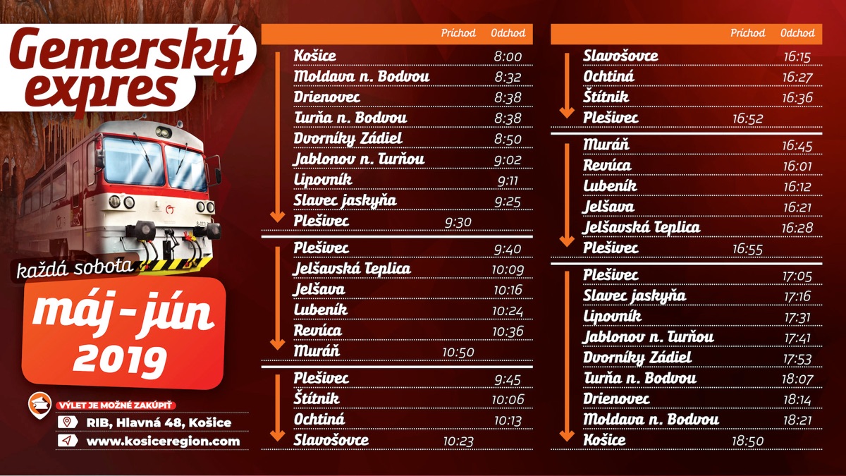 „Gemerský expres bude premávať každú sobotu od 4. 5. do 22. 6. 2019 (vrátane) s ranným odchodom o 8.00 hod. z košickej železničnej stanice. V stanici Plešivec sa súprava rozpojí a cestujúci si môžu zvoliť, ktorým smerom budú pokračovať – buď na Slavošovce, alebo Muráň. Cestujúci si tak môžu naplánovať aj viacero sobôt a objavovať nespočetné množstvo zaujímavých zákutí, ktoré táto lokalita ponúka,“ doplnila výkonná riaditeľka Košice Región Turizmus Lenka Vargová Jurková. Návrat do Košíc je o 18.50 hod.