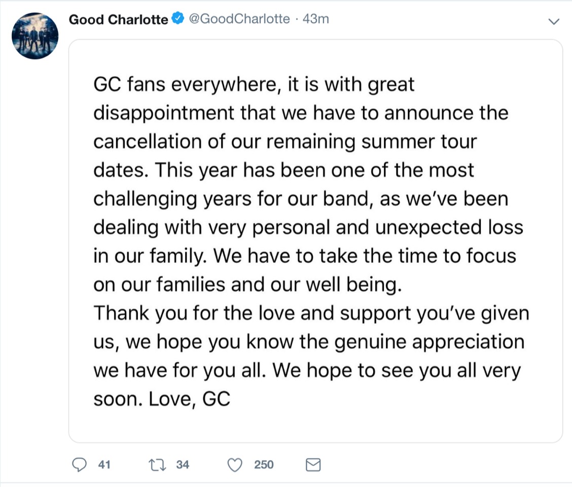 Bratislavský koncert kapely Good Charlotte, ktorý sa mal uskutočniť 13. augusta 2019 v Refinery Gallery, je zrušený. Kapela Good Charlotte sa z osobných dôvodov rozhodla nevycestovať na európske turné a ruší sa preto nielen ten bratislavský, ale všetky európske koncerty. Vstupné vo výške 34 eur za vstupenku bude vracať Lístocheck postupne všetkým, ktorí si lístok kúpili. Dôvody zrušenia vysvetlila kapela vo veľmi emotívnej správe na svojom Twittri: