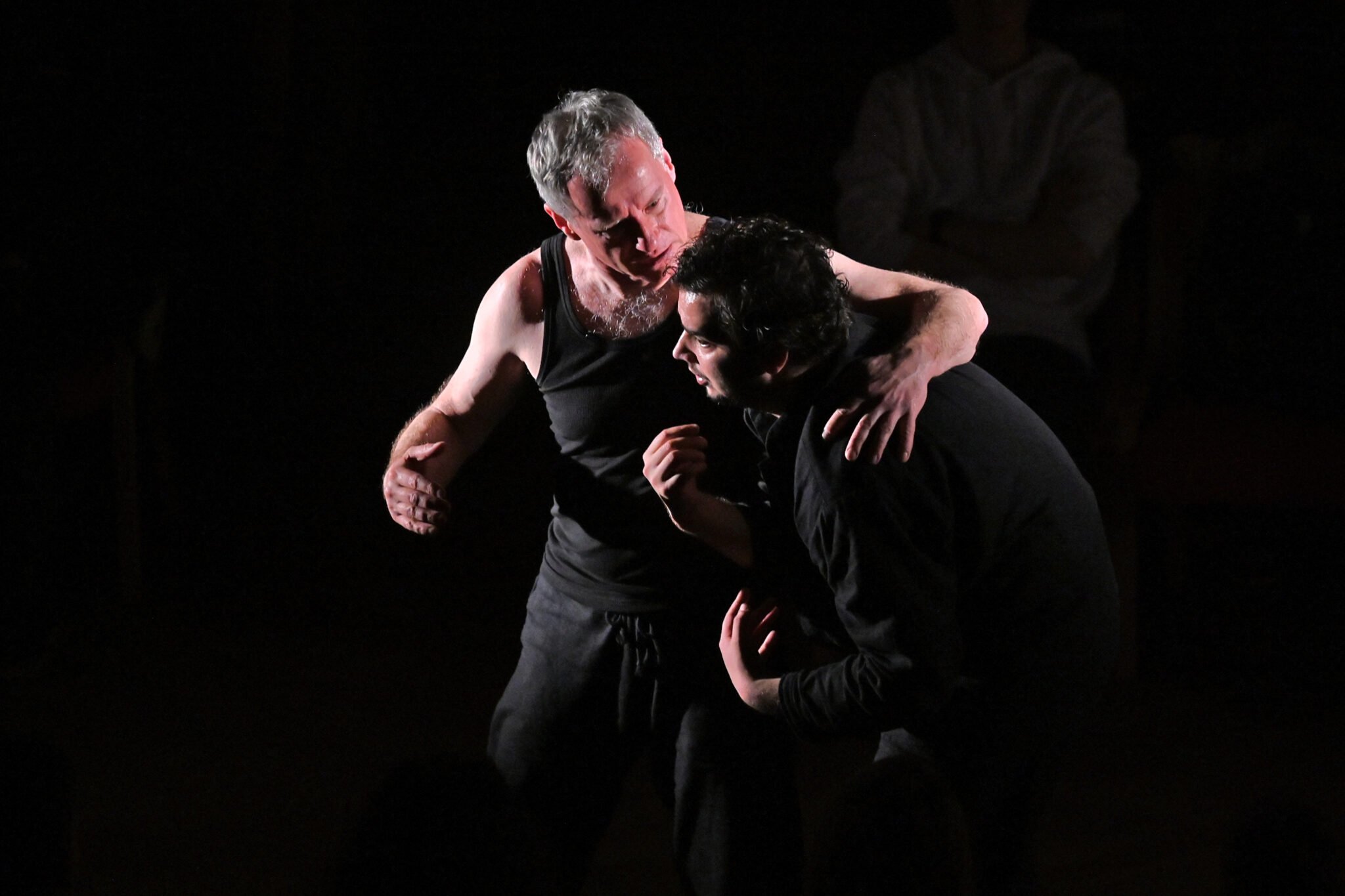 Hamlet je tu rozštiepeným vedomím – stvárňuje ho dvojica hercov Peter Čižmár a Dávid Szöke. Každý z nich nesie iný odtieň smútku, inú podobu váhania. Obaja sa v okamihu premieňajú na všetky postavy Elsinoru a pred divákmi tak vzniká asketický, surový a pritom nesmierne plastický svet, vystavaný len z hlasu, fyzickosti a absolútnej blízkosti.