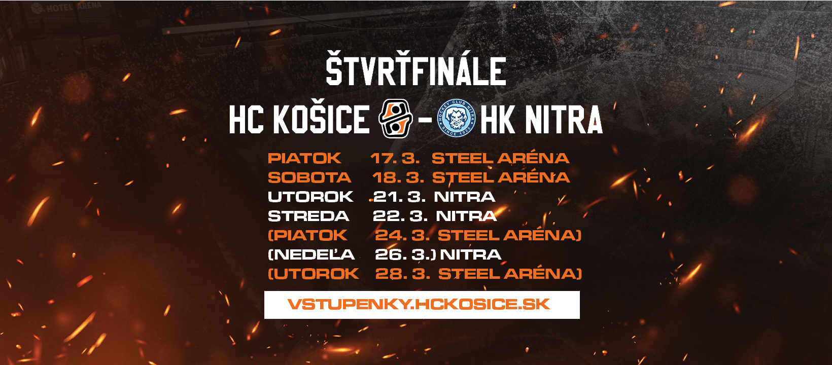 Vážení fanúšikovia HC Košice, pozývame vás na štvrťfinálový zápas proti HK Nitra, ktorý sa uskutoční 24. 3. (piatok) o 18:00 v Steel aréne.