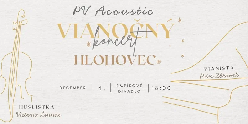 Po úspešnom minuloročnom turné, ktoré zaplnilo sály po celom Slovensku, zavíta duo PV Acoustic so svojím nádherným vianočným koncertom aj do Hlohovca! Príďte si vychutnať nezabudnuteľný umelecký zážitok a stráviť príjemný večer plný inštrumentálnej hudby, ktorá vám zaručene vyčarí úsmev na tvári. Môžete sa tešiť na tradičné koledy, známe piesne z obľúbených vianočných rozprávok i najväčšie domáce a zahraničné hity Vianoc v unikátnom podaní klavíra a huslí.