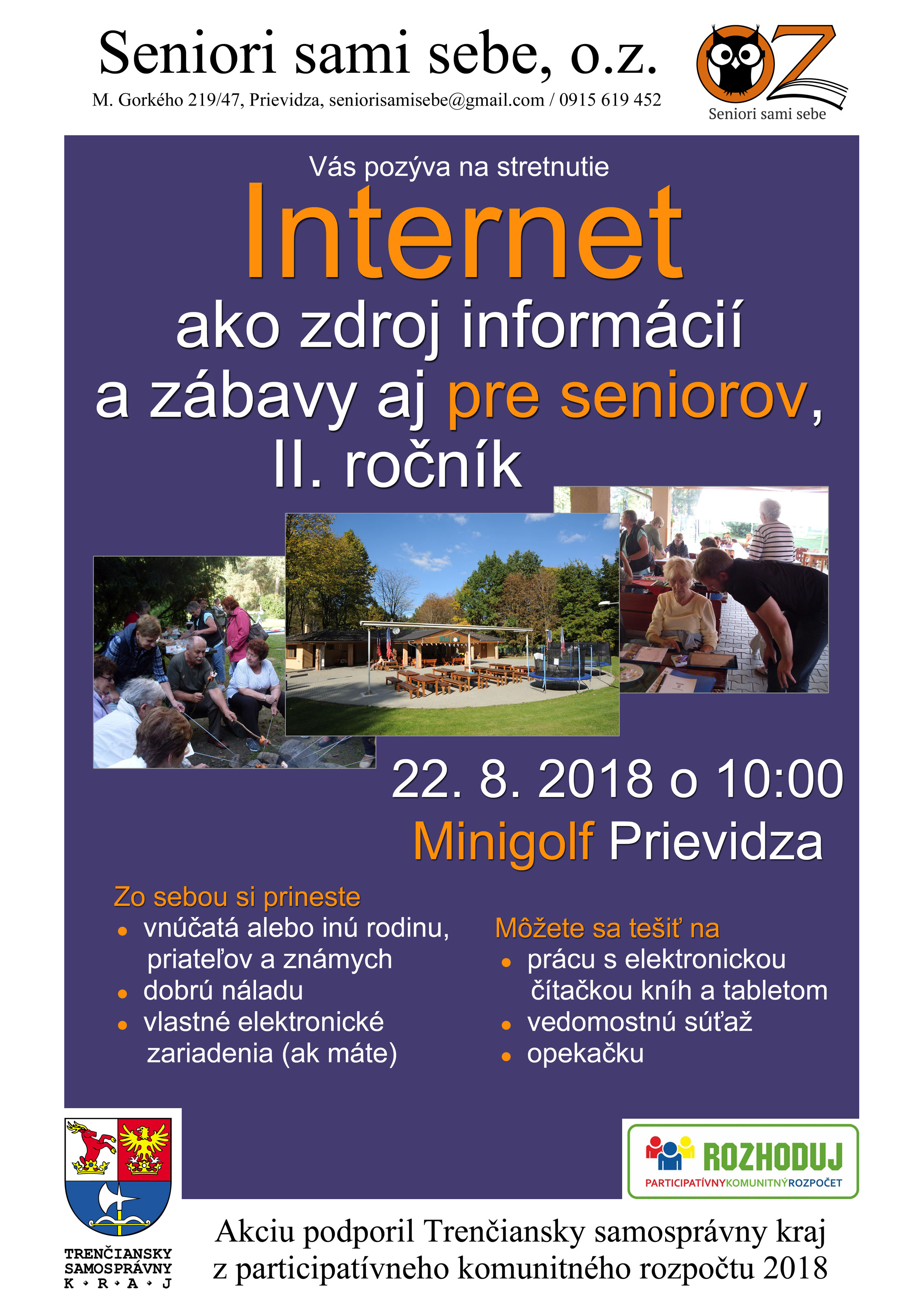 Po úspešnom 1. ročníku podujatia "INTERNET ako zdroj informácií a zábavy aj pre seniorov" sme tento rok pripravili II. ročník, kde Vás chceme oboznámiť s ďalšou technickou "vychytávkou" - elektronickou čítačkou kníh. Zopakujeme si stručné zásady používania tabletu a tiež si zasúťažíme. Po oficiálnej časti podujatia budeme mať voľný program spojený s opekačkou. Vstup zdarma, podujatie podporil TSK prostredníctvom participatívneho rozpočtu 2018. Tešíme sa na Vás a veríme, že prídete v hojnom počte. Vzhľadom na to, že termín je cez prázdniny, vítané sú aj vnúčatá.]]>
