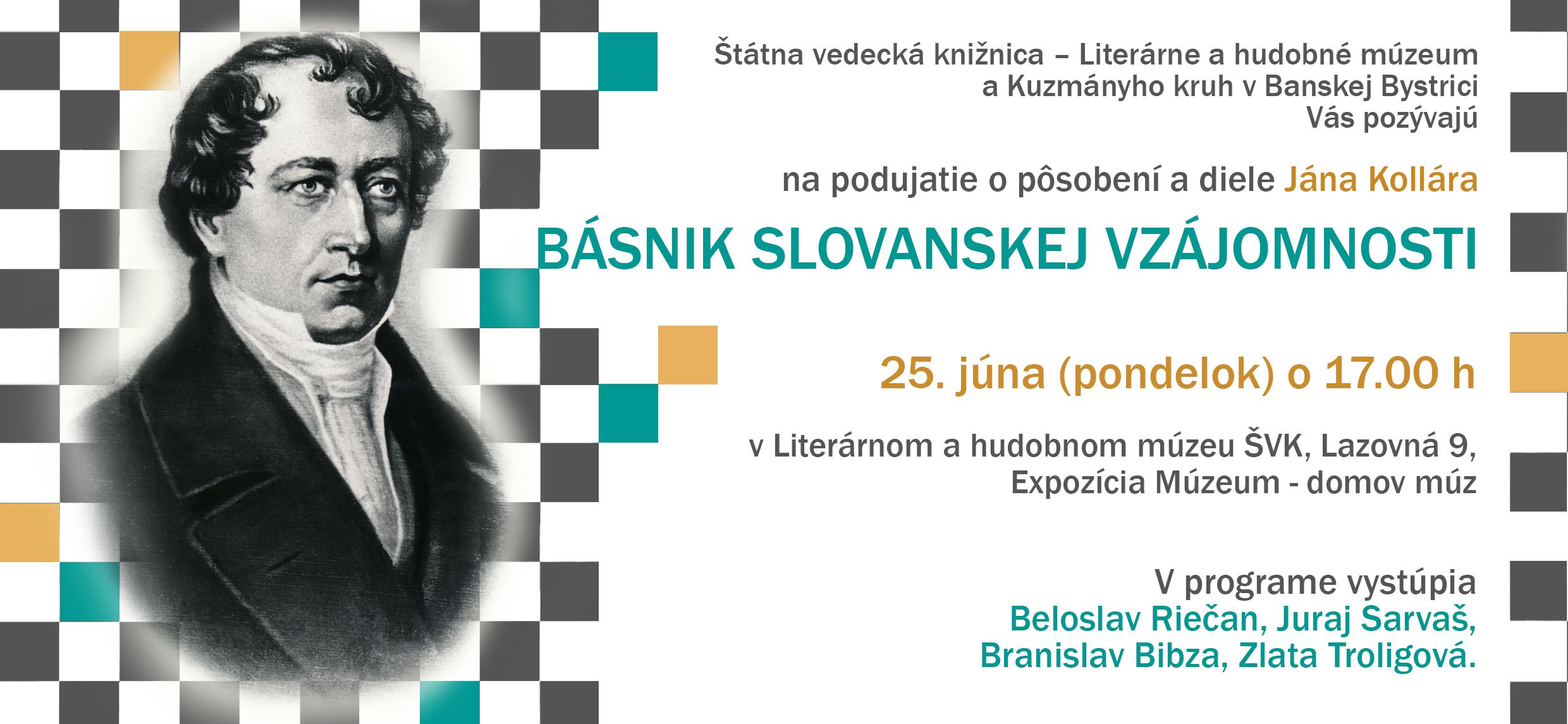 Štátna vedecká knižnica – Literárne a hudobné múzeum a Kuzmányho kruh v Banskej Bystrici si Vás dovoľujú pozvať na podujatie venované Jánovi Kollárovi (1793 – 1852) pri príležitosti jeho 225. výročia narodenia.