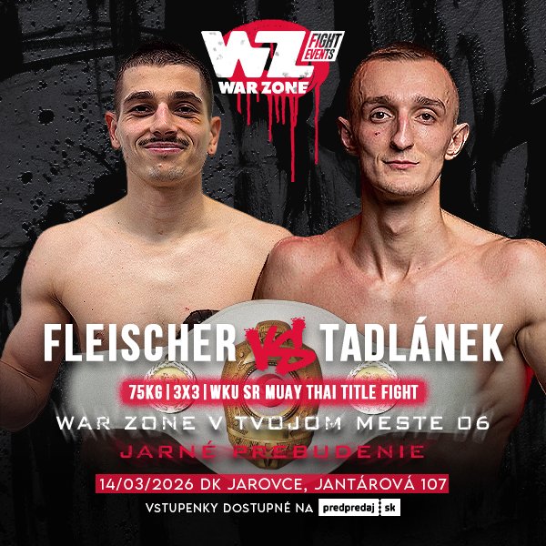 Čaká ťa zápas o majstra Slovenska Muay Thai organizácie WKU -75 kg, v ktorom sa stretnú Richard Fleischer vs. Adrian Tadlánek.