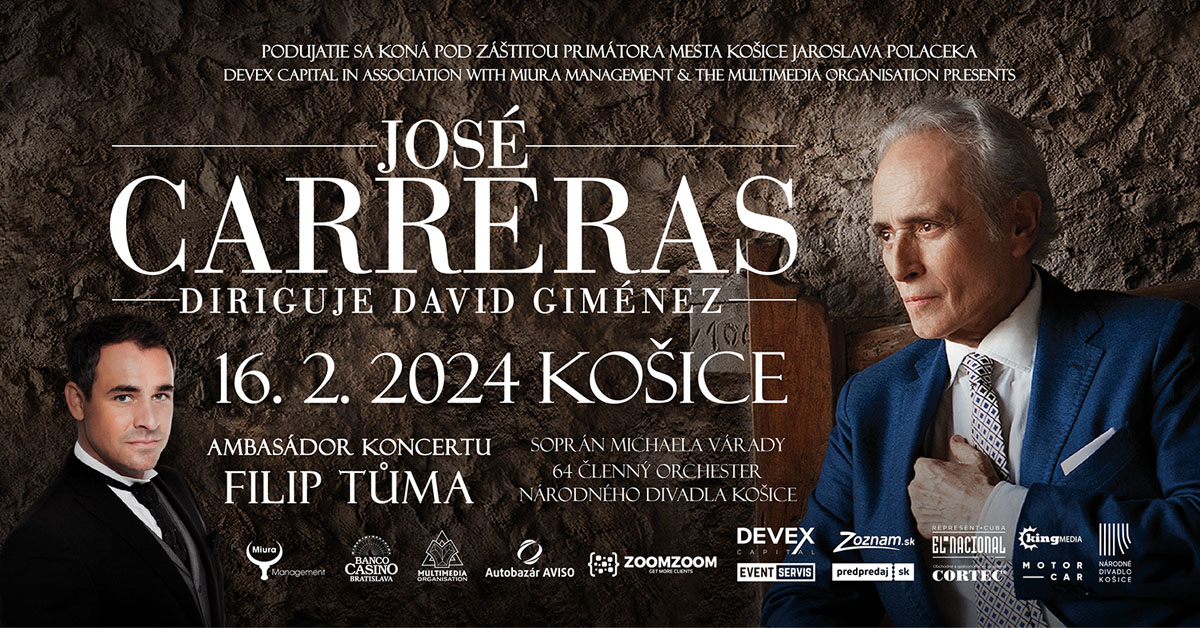 Hviezdny tenor označovaný za „najmilšieho človeka operného sveta“ sa vráti po 13-tich rokoch do Košíc, kde vystúpi v doprovode Orchestra opery ND Košice a sólistky opery Michaely Várady 16.februára v Steel Aréne. Ambasádorom koncertu je známy spevák a herec Filip Tůma! Na koncerte vystúpi spoločne s José Carrerasom!