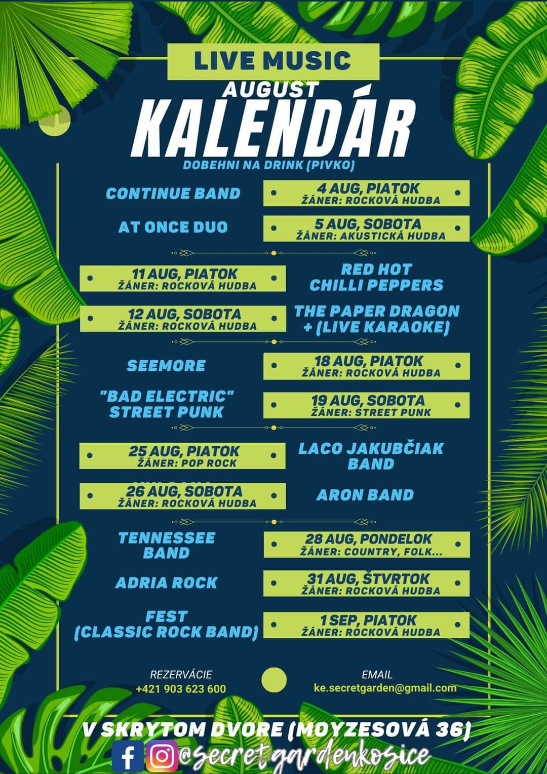 Každý víkend koncerty, všetkých žánrov. Každý si príde na svoje. Plus príjemné posedenie v Skrytom dvore priamo v centre Košíc, no mimo ruchu davu veľkomesta, s grilom a širokým výberom pív a koktailov.